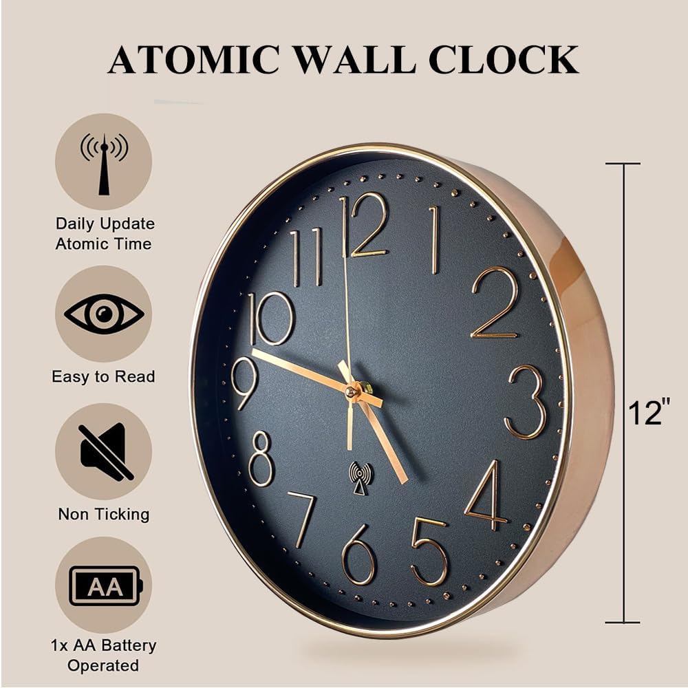 Atomic Time Analog Wall Clock | 12'' Radio controlled wall clock, Sets Time Automatically | Quartz Movement | Battery Operated | Classic Design