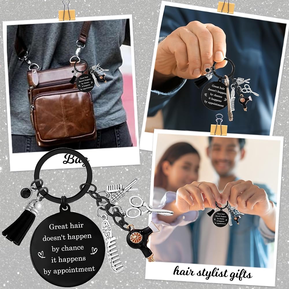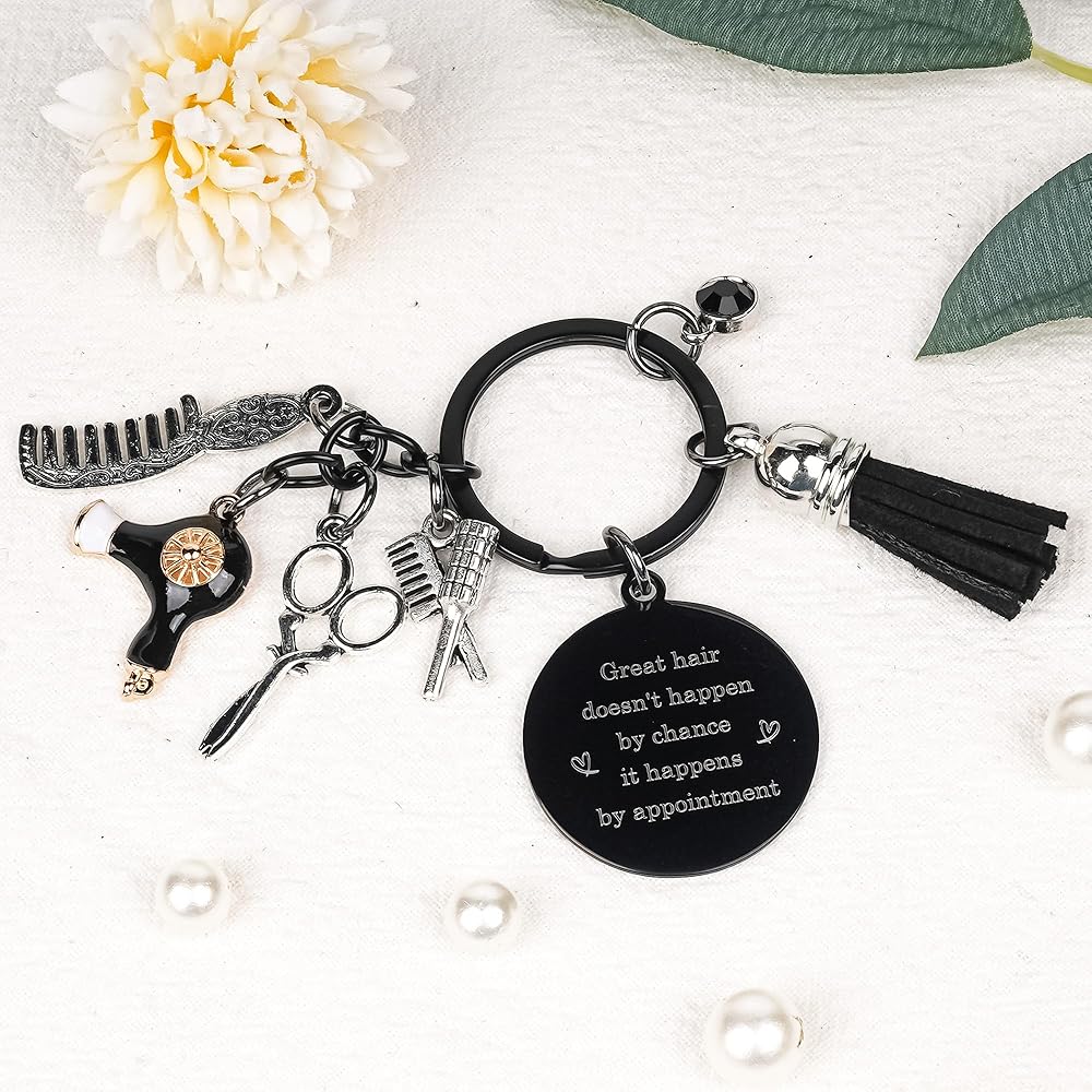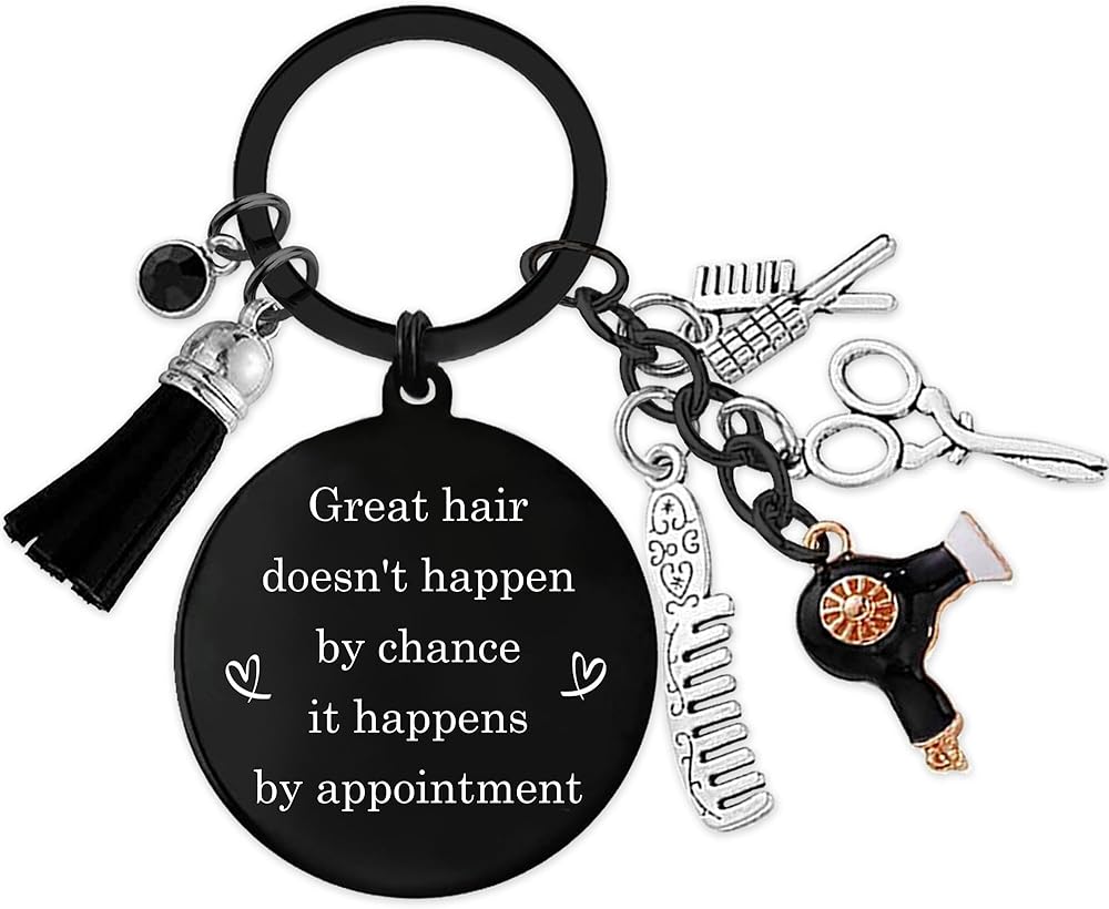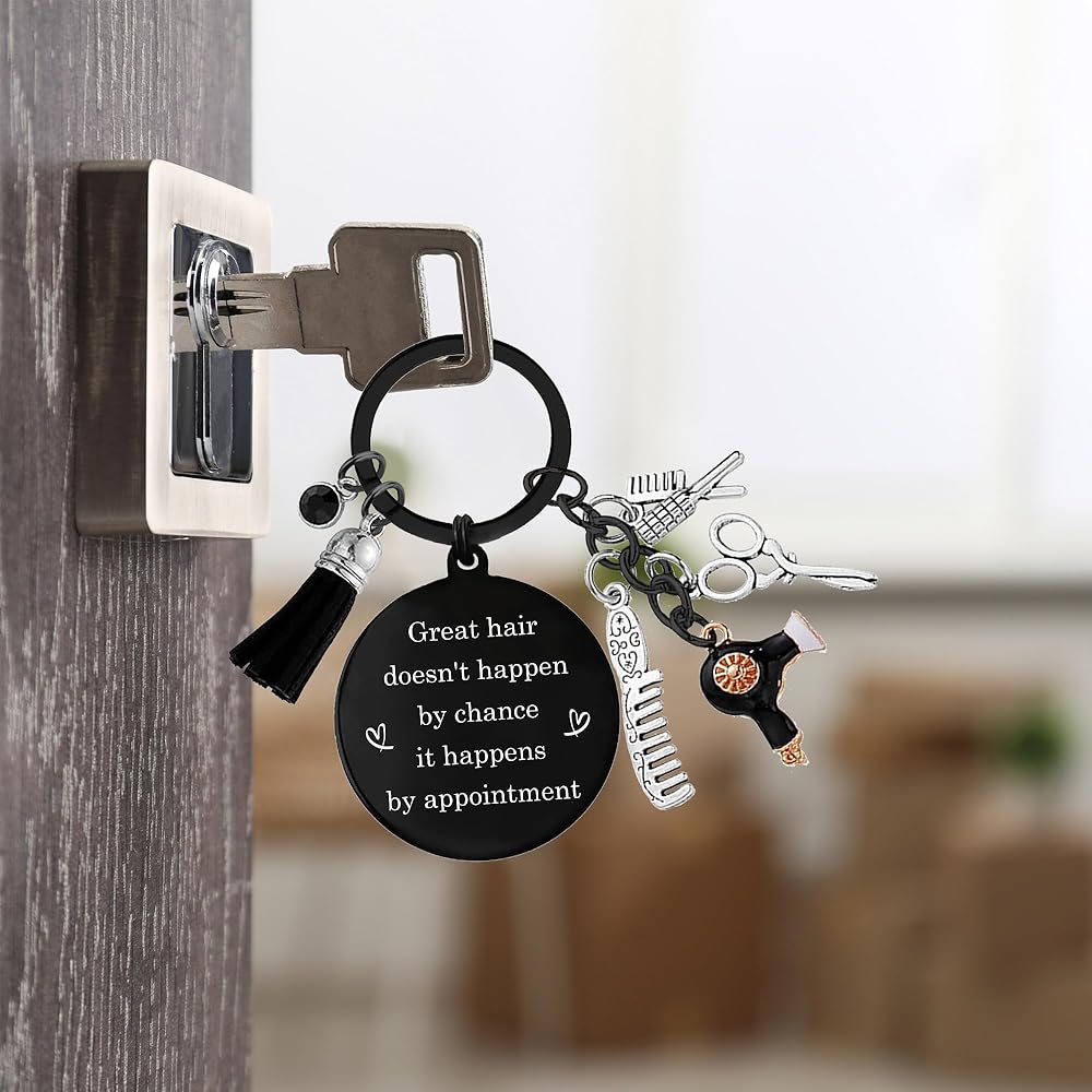 • تصميم سلسلة مفاتيح Hair Dresser: سلسلة المفاتيح هذه أنيقة. الكلمات الملهمة تجعلها ملحقًا رائعًا لتصفيفة الشعر ، ويأتي مع إكسسوارات صغيرة مثل المشط والمقص ومجفف الشعر. سواء كانت متصلة بالمفاتيح أو الأكياس ، فهو خيار جيد
