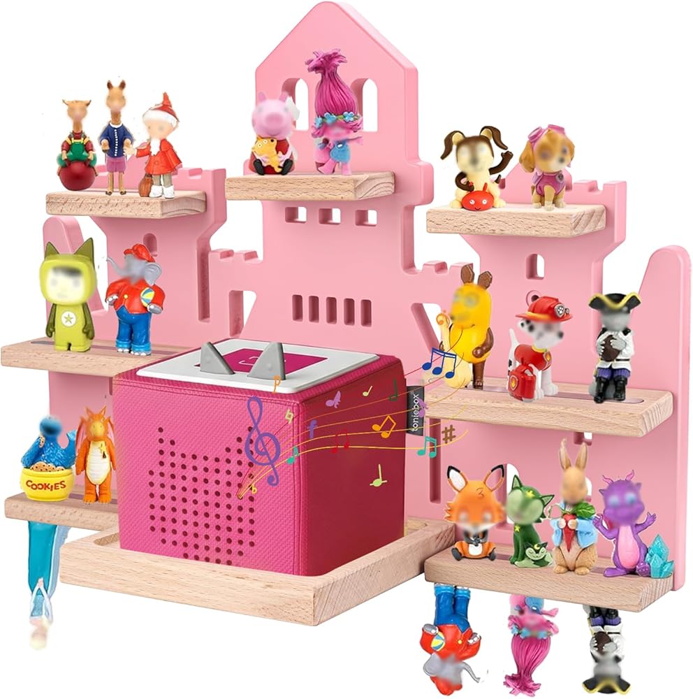 Tonie Shelf for Tonies Box Set - Tonie Storage for Tonie Box & Tonies Figures & Charging Station ، رف عائم خشبي مغناطيسي لـ Toniebox و 15-33 Tonies ، رف محمولة على الحائط ، شكل القلعة