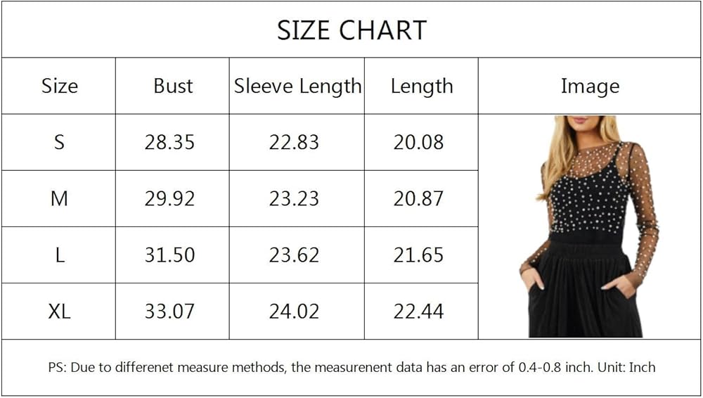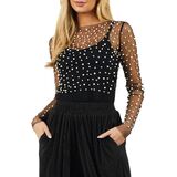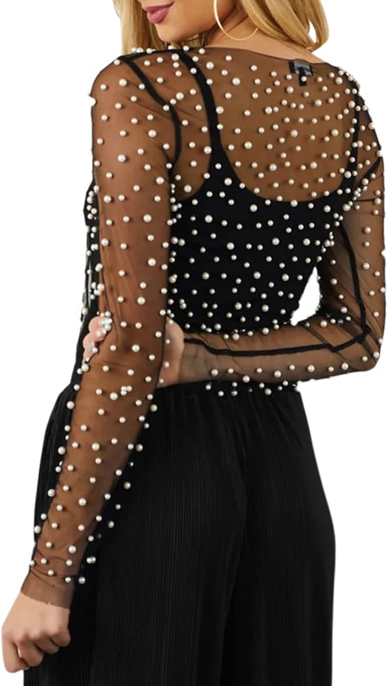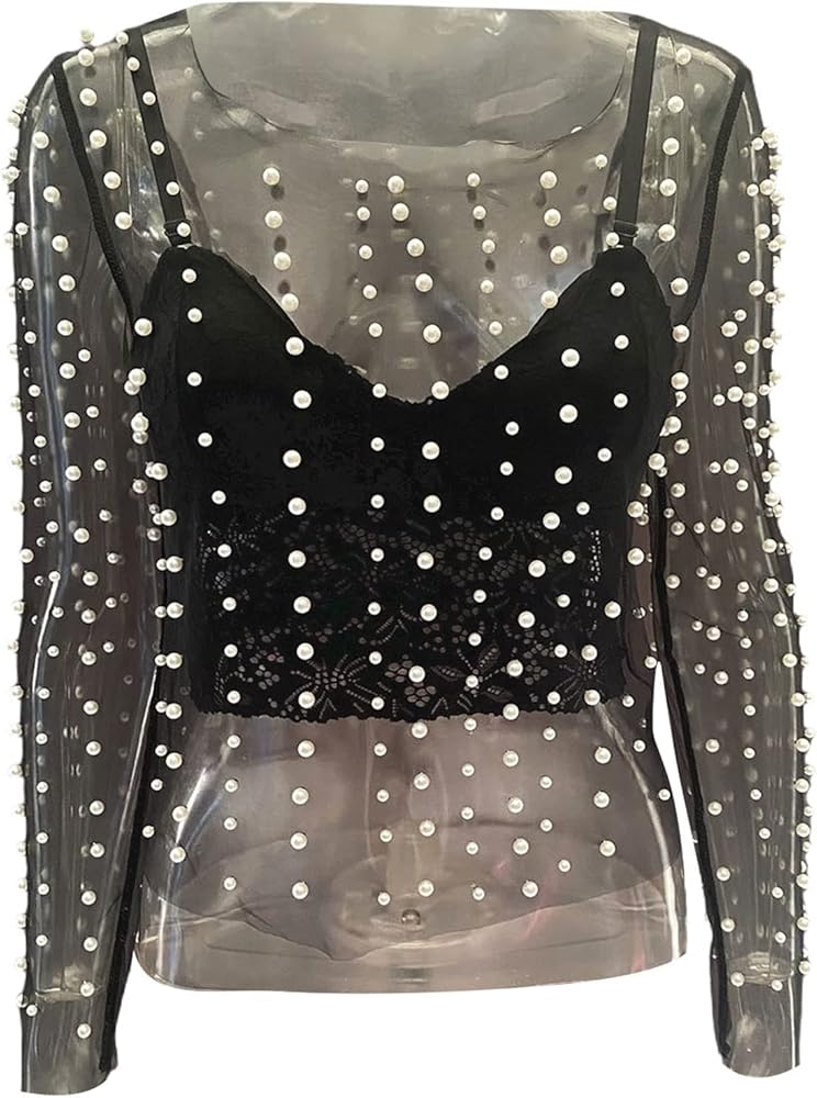 العبوة: 1x بلوزة لؤلؤية شبكية شفافة للنساء.