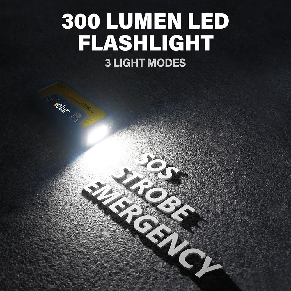 • Cordless Smart Emergency Air Compressor: JP400 Jump Starter مع ضاغط الهواء يوفر 150 PSI تدفق الهواء يؤدي بسرعة إلى تضخيم إطارات السيارات في غضون دقائق قليلة. تم تصميم هذا الإطارات وفوز البطارية مع الإغلاق المسبق والاستخدام التلقائي ، سهل الاستخدام. ما عليك سوى تحديد 4 أوضاع للتضخم (السيارات ، الدراجات النارية ، الدراجات ، الكرات) في الشاشة وضبط الضغط. سيتوقف تلقائيًا عن التضخم عند الوصول إلى قيمة الإعداد المسبق.