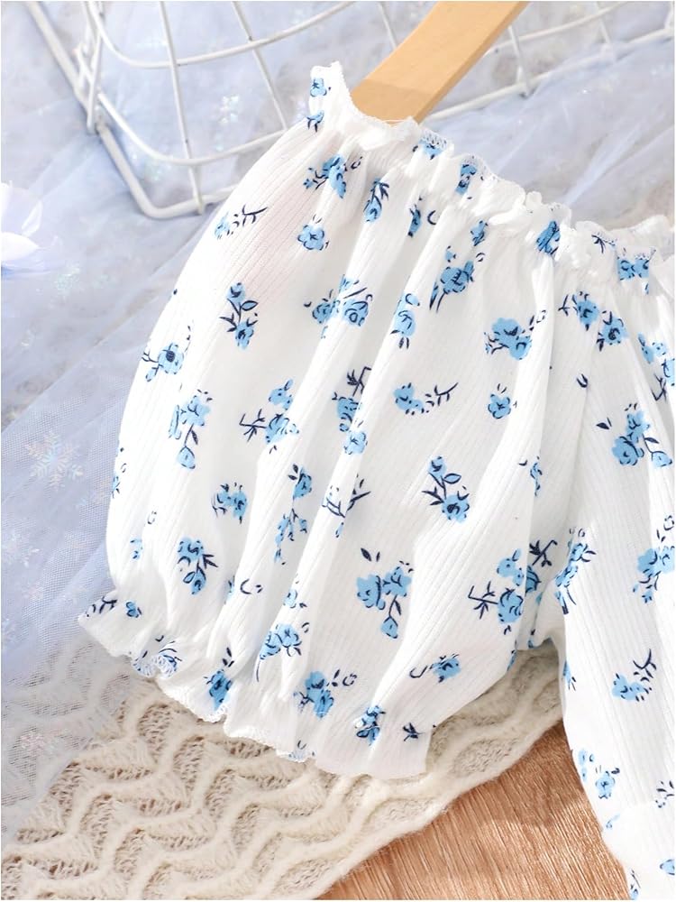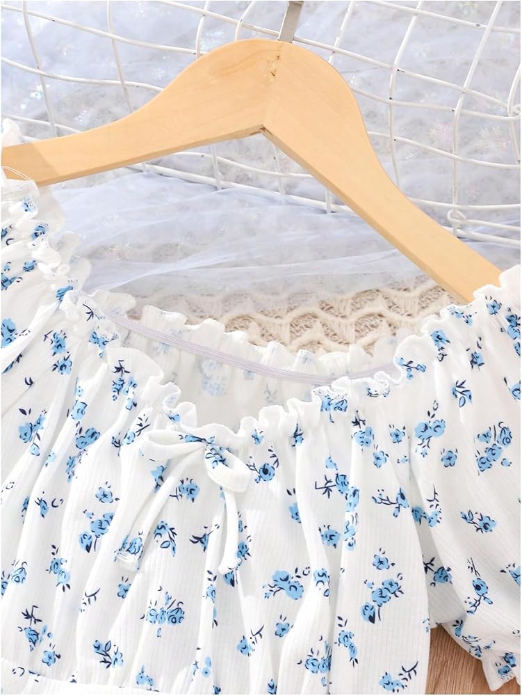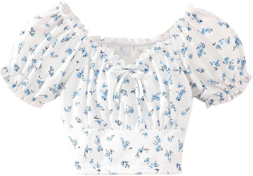 • Design: Floral print, puff sleeve, short sleeve, scoop neck, frill trim, bowknot front, crop tee shirts