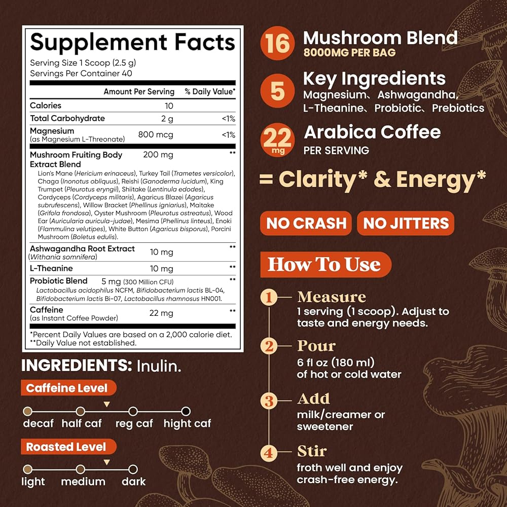 16 مجمع الفطر: هذا المزيج المدروس من 16 فطر يشمل Mane Lion و Reishi و Chaga و Enoki لدعم العقل والجسم والتوازن - يسيطر على ما مجموعه 17300 ملجم من الفطر الخام المكافئة لكل وجبة.