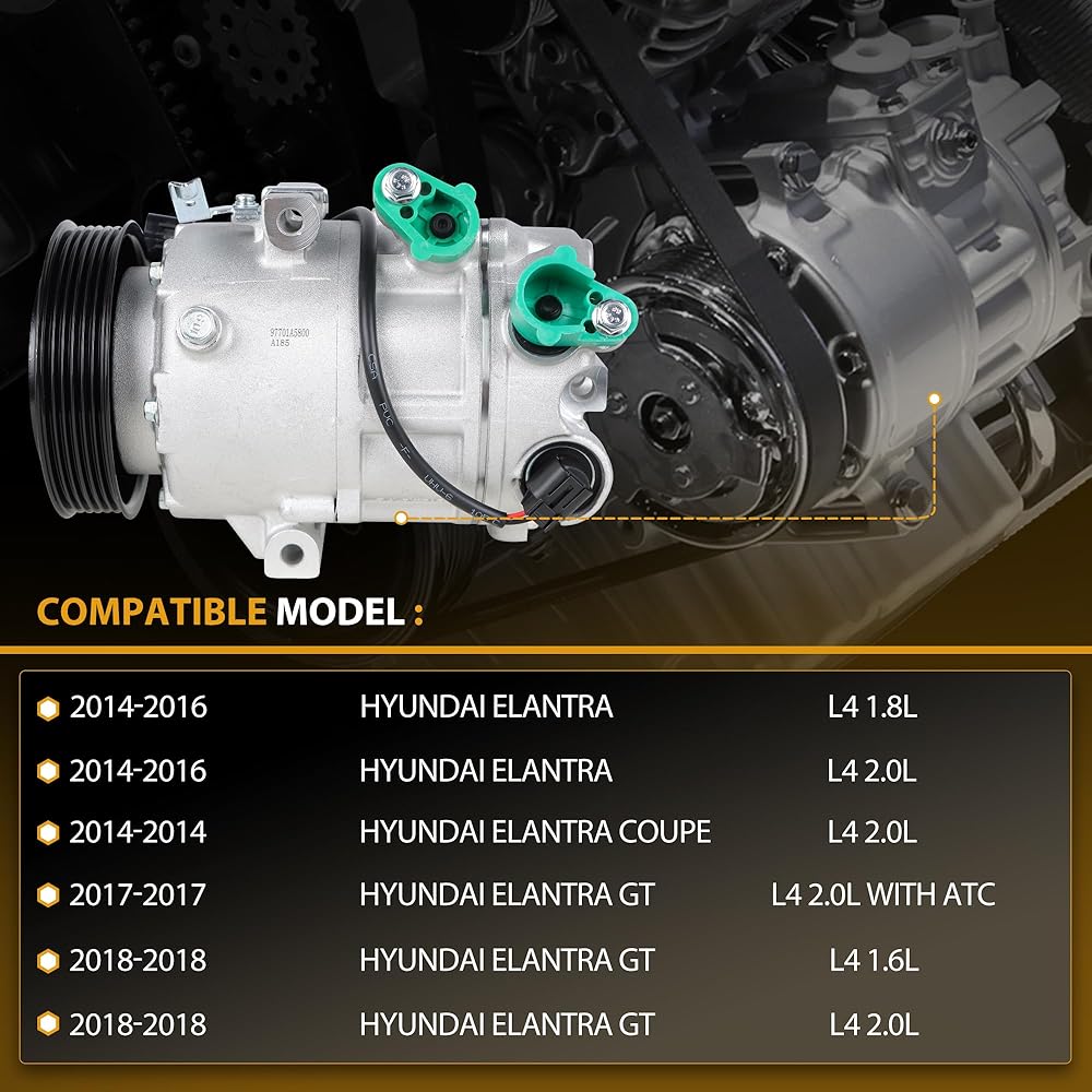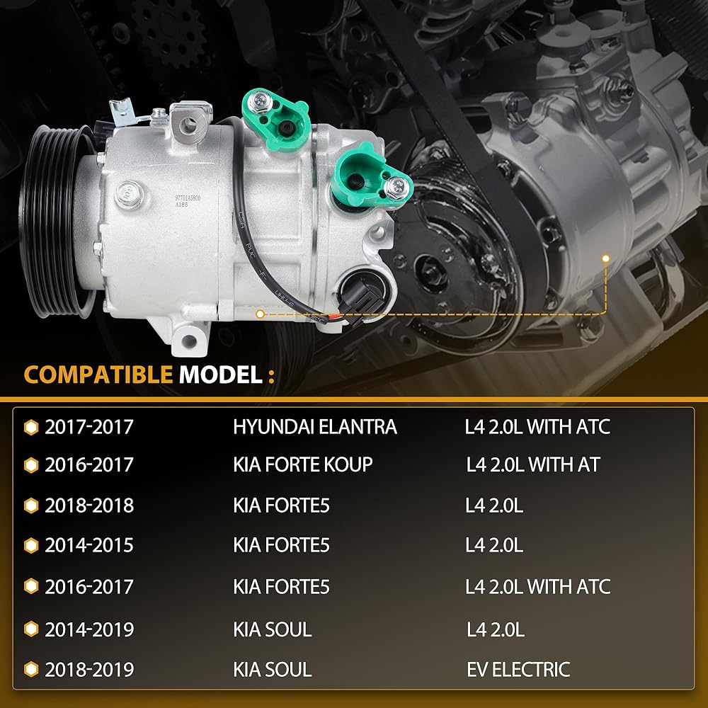 التوافق: هذا ضاغط A/C يناسب Hyundai Elantra 2014-2017 1.8L 2.0L ، 2014-2018 KIA FORTE 1.8L ، 2014-2017 KIA FORTE KOUP 1.8L ، 2014-2019 KIA SOUL L4 2.0L