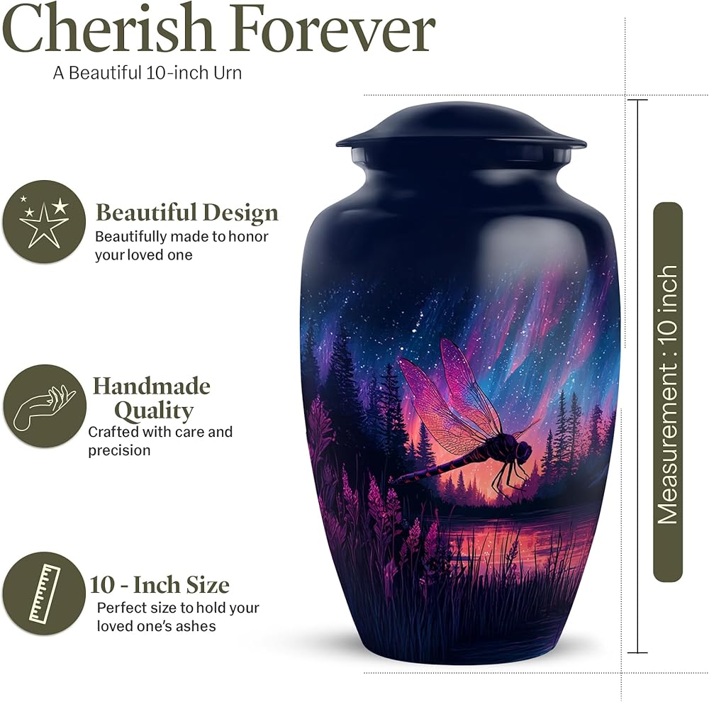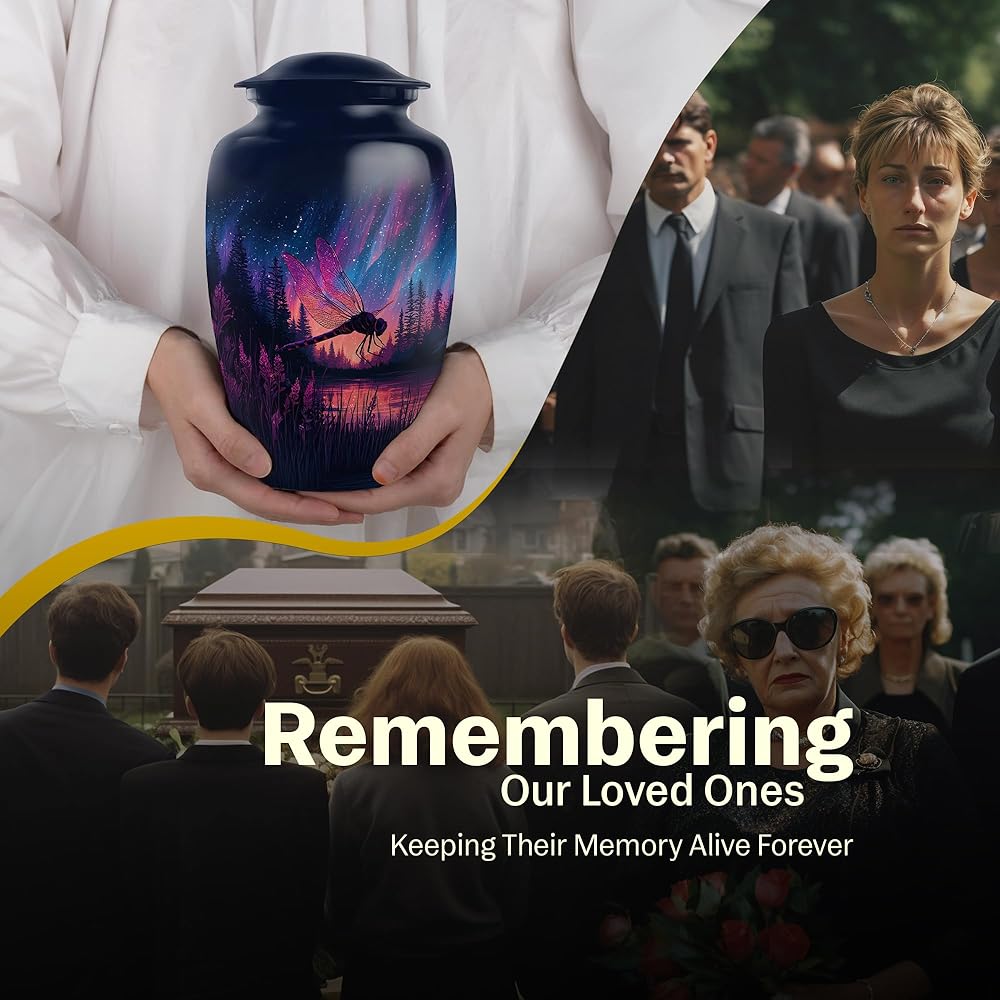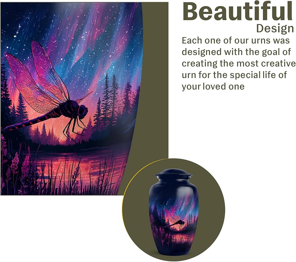 Honor your loved one with this exquisitely decorative urn for ashes adult male a symbol of transformation, love, and everlasting remembrance. Crafted from premium-quality metal, this durable and elegant urn for ashes for women features a stunning finish with intricately detailed artwork, representing the beauty of the soul's journey. Designed to securely hold the remains of an adult, this ashes urns provides a dignified and graceful final resting place for a cherished individual. Whether you seek urns for human ashes adult man or a uniquely feminine tribute, this urn's timeless aesthetic makes it a perfect choice for both men and women. The carefully polished surface enhances the cremation urns for women 's beauty ensuring it remains a standout memorial piece for generations. This funeral urn is designed for both security and peace of mind. Our urns for human ashes adult female features a threaded, screw-on lid that provides an airtight, leak-proof seal, ensuring the ashes remain protected and undisturbed. Built for long-lasting durability, this adult urn is crafted to withstand the test of time, allowing you to preserve your loved one's memory with confidence. The lightweight yet sturdy construction of our human urns for ashes makes it easy to handle and place in a home, niche, columbarium, or burial site. Whether displayed on a mantel, shelf, or memorial space, this Dragonfly urn, which is a cremation urn for ashes for women serves as a lasting symbol of love and remembrance. Ideal for those looking for urns for human ashes adult man with a soft and elegant touch, this urn seamlessly blends sophistication and heartfelt sentiment. It is not just a vessel but a meaningful tribute that provides comfort and solace. Whether you are purchasing for yourself or as a sympathy gift, this beautifully designed urn ensures your loved one's legacy is honored with grace, beauty, and dignity.