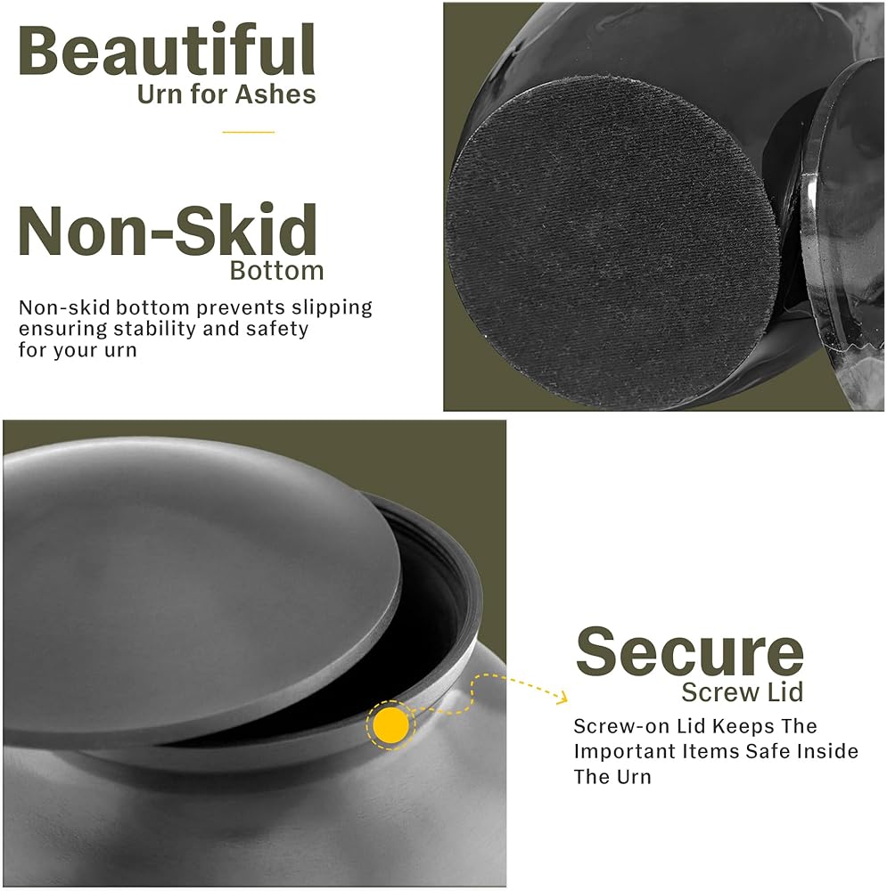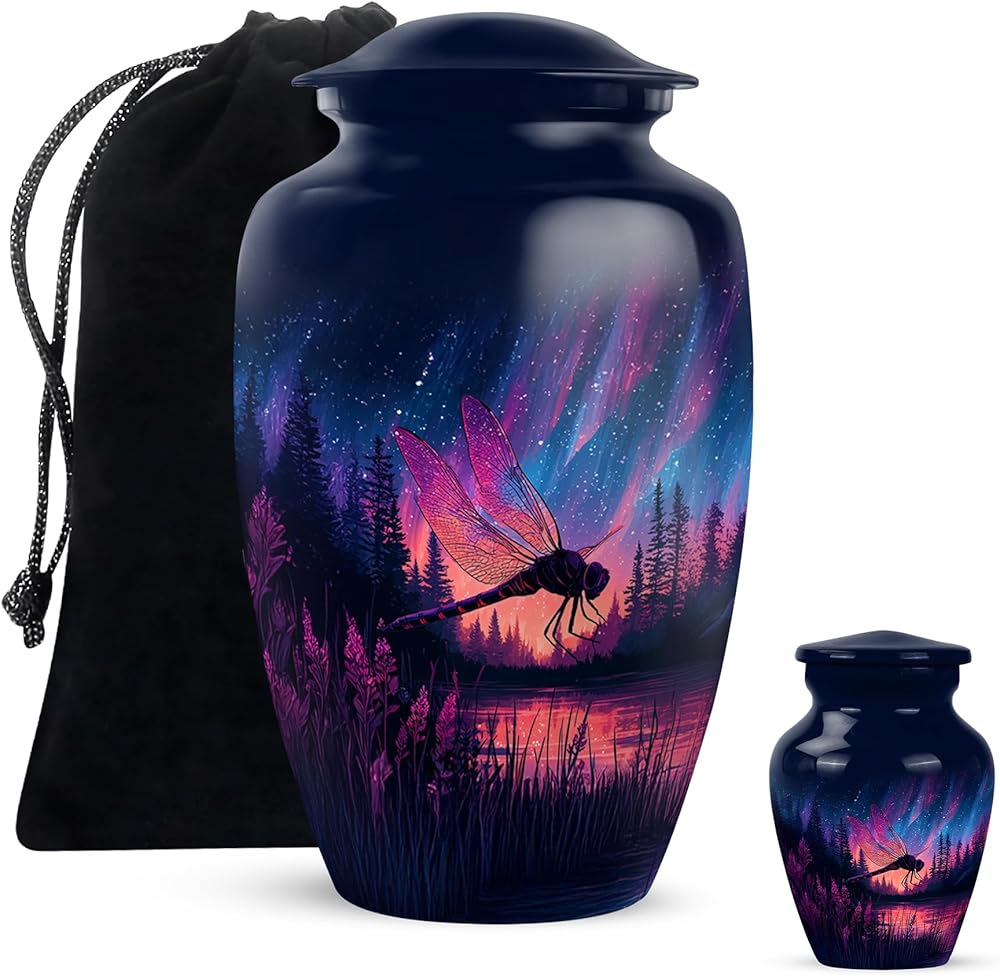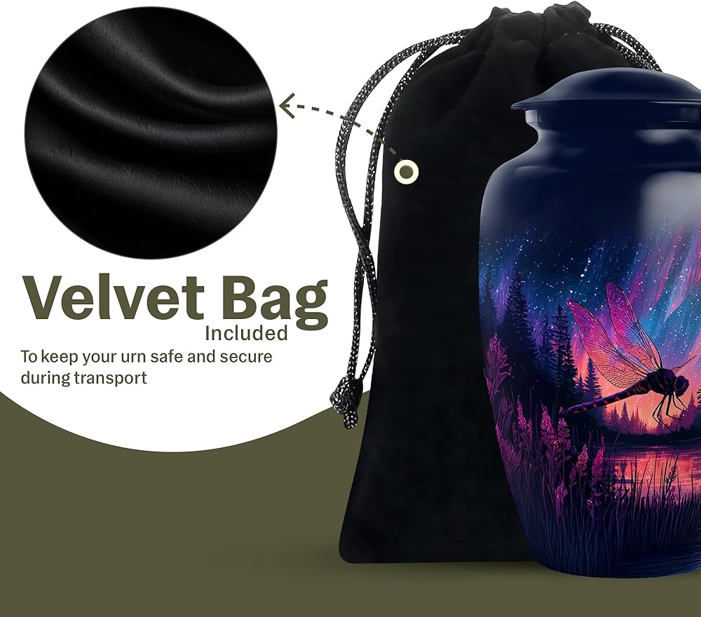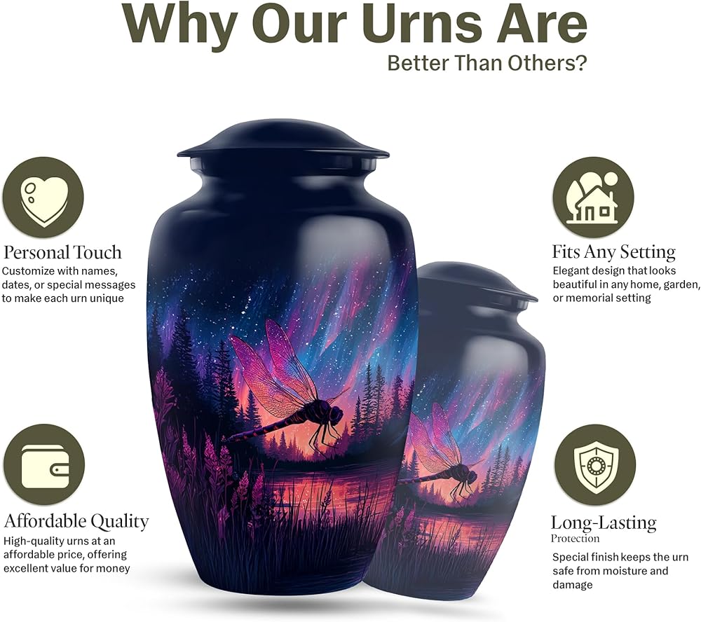 Honor your loved one with this exquisitely decorative urn for ashes adult male a symbol of transformation, love, and everlasting remembrance. Crafted from premium-quality metal, this durable and elegant urn for ashes for women features a stunning finish with intricately detailed artwork, representing the beauty of the soul's journey. Designed to securely hold the remains of an adult, this ashes urns provides a dignified and graceful final resting place for a cherished individual. Whether you seek urns for human ashes adult man or a uniquely feminine tribute, this urn's timeless aesthetic makes it a perfect choice for both men and women. The carefully polished surface enhances the cremation urns for women 's beauty ensuring it remains a standout memorial piece for generations. This funeral urn is designed for both security and peace of mind. Our urns for human ashes adult female features a threaded, screw-on lid that provides an airtight, leak-proof seal, ensuring the ashes remain protected and undisturbed. Built for long-lasting durability, this adult urn is crafted to withstand the test of time, allowing you to preserve your loved one's memory with confidence. The lightweight yet sturdy construction of our human urns for ashes makes it easy to handle and place in a home, niche, columbarium, or burial site. Whether displayed on a mantel, shelf, or memorial space, this Dragonfly urn, which is a cremation urn for ashes for women serves as a lasting symbol of love and remembrance. Ideal for those looking for urns for human ashes adult man with a soft and elegant touch, this urn seamlessly blends sophistication and heartfelt sentiment. It is not just a vessel but a meaningful tribute that provides comfort and solace. Whether you are purchasing for yourself or as a sympathy gift, this beautifully designed urn ensures your loved one's legacy is honored with grace, beauty, and dignity.