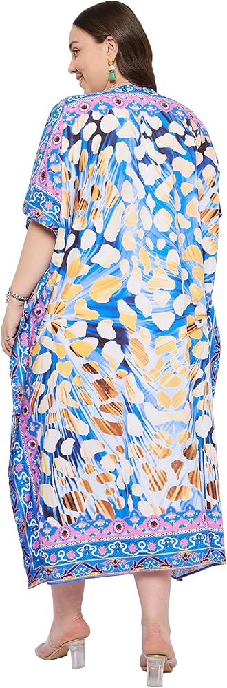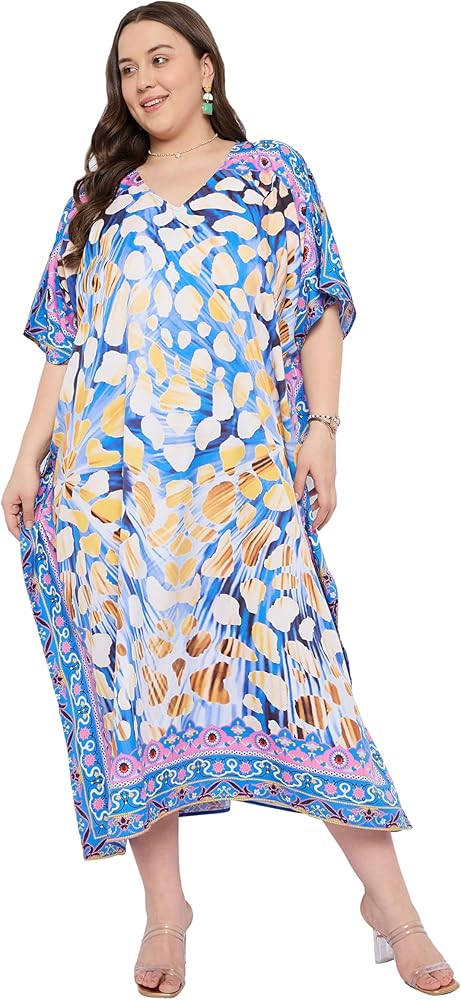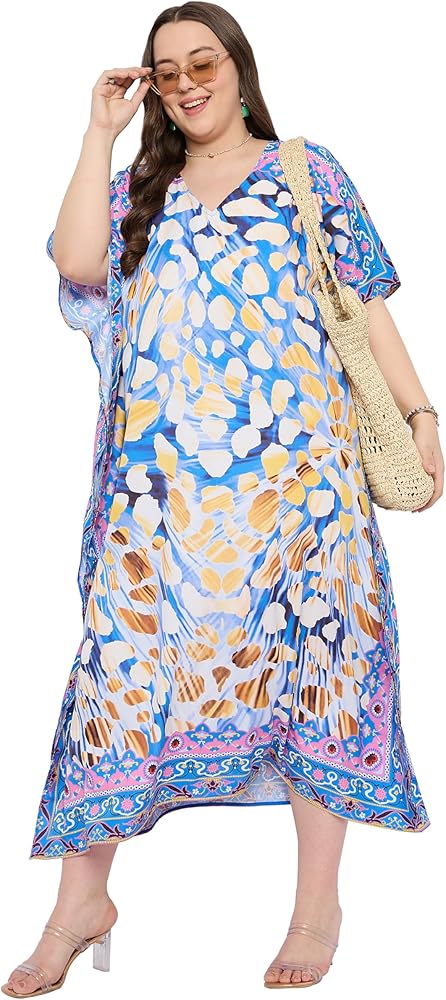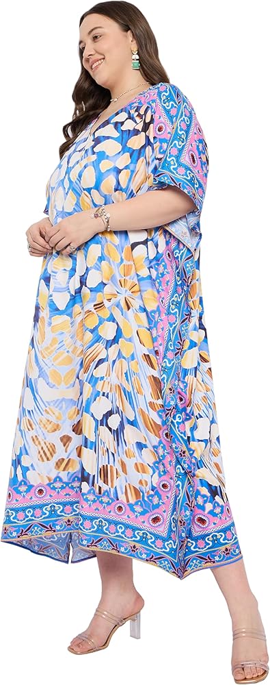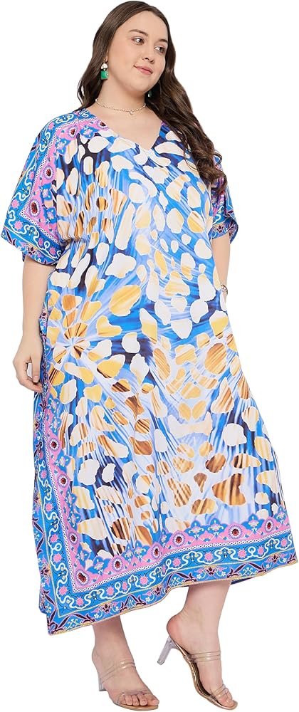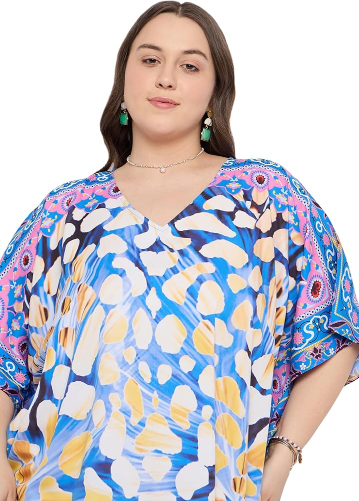 Our kaftan for women is made in high quality polyester fabric that feels luxurious and is ideal for casual as well as everyday wear. The lightweight polyester fabric is breathable and comfortable, making it an ideal choice for summer wear. It moves with your body for added comfort, whether you're lounging at home or attending a special event. This kaftan dress for women is high in style and low in price. Long printed kaftans are versatile and stylish wear for a beach day or a casual hangout. The casual caftan dress with intricate pattern gives a sophisticated finish along with 3/4 kimono sleeves with styled border design. Available in plus size kaftans are your way to a stylish wardrobe for your special occasions. Kaftan dress is the perfect wear for your daily wear as well as party wear. The timeless print on the kaftan is perfect party-wear to make you shine in glam. Wrinkle-Free Fabric: Forget about ironing! This kaftan is crafted with a special wrinkle-resistant fabric, ensuring it stays smooth and fresh-looking even after long wear or packing. Shrink-Free: Made from durable, high-performance polyester, this kaftan is designed to retain its size and shape after washing, so you never have to worry about it shrinking. A slight variation may occur in colors and size specifications. Colors may appear slightly different via website due to computer picture resolution and monitor settings.