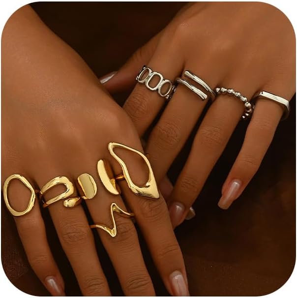 Dainty Chunky Gold Knuckle Rings Set Stackable for Women, Statement Thick Hollow Oval Huggie Wavy Mixed Metal Joint Midi Finger Open Ring Pack Jewelry