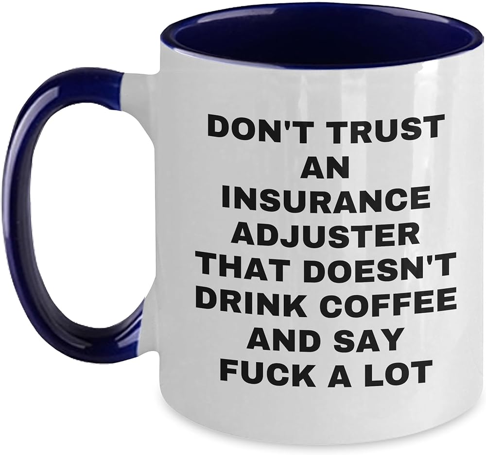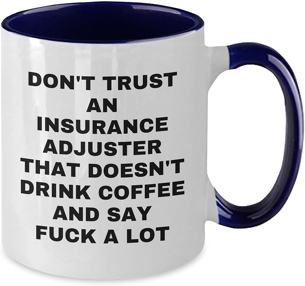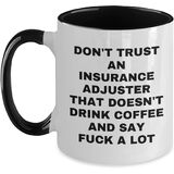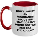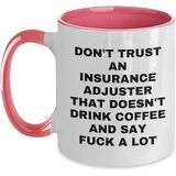Looking for a unique Valentine's gift for your favorite Insurance Adjuster? This two-tone coffee mug is the perfect choice! Don't Trust An Insurance Adjuster That Doesn't Drink Coffee And Say F--k A Lot - we've got your Insurance Adjuster covered. This 11oz ceramic mug is available in four color combinations - Black and White, Red and White, Navy and White, and Pink and White - and features a humorous quote that's sure to bring a smile to their face. Whether you're a friend, family member, or coworker, this gift is a thoughtful and practical way to show your appreciation for your Insurance Adjuster. So go ahead and get their coffee fix - and their sense of humor - with this funny insurance adjuster coffee mug. Their Insurance Adjuster senses will thank you!
