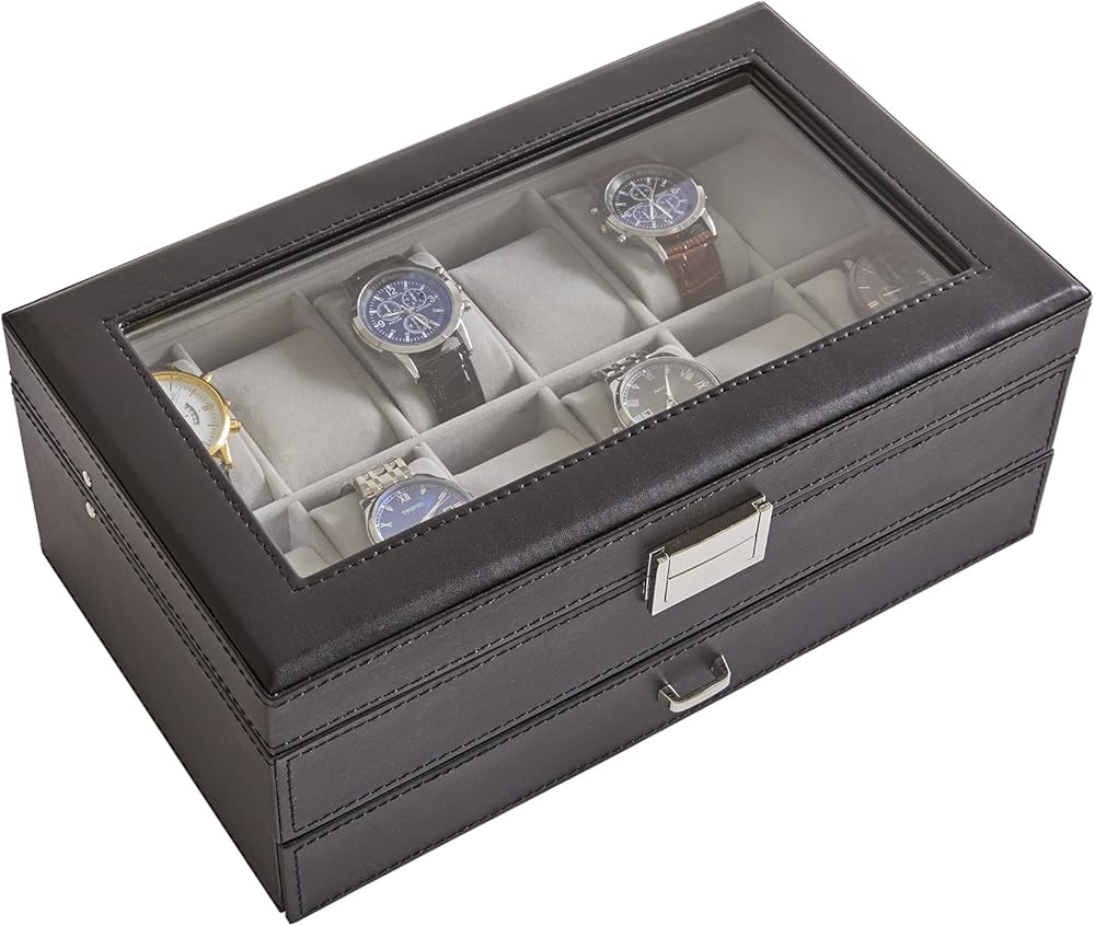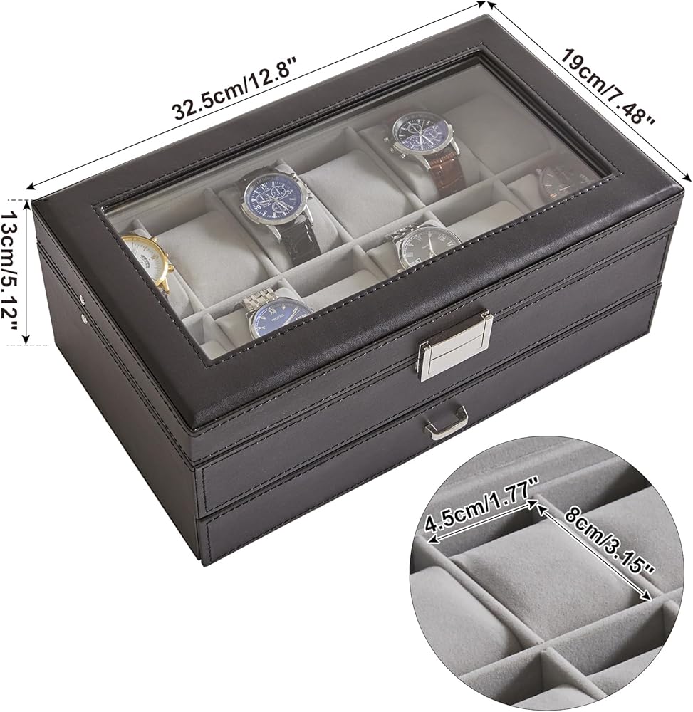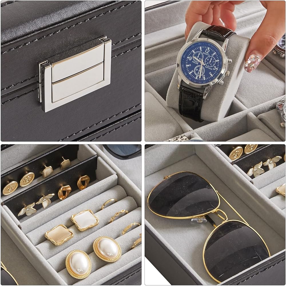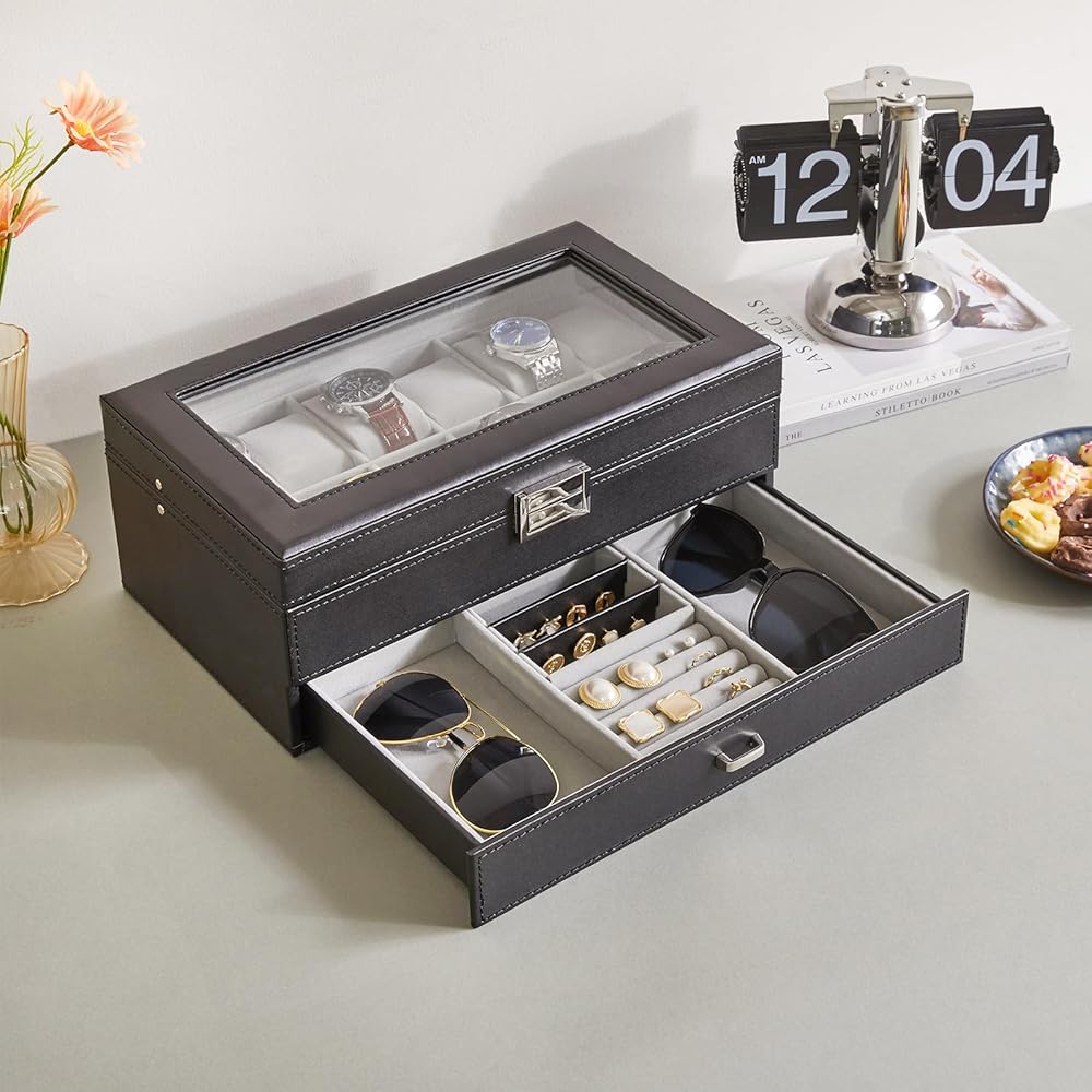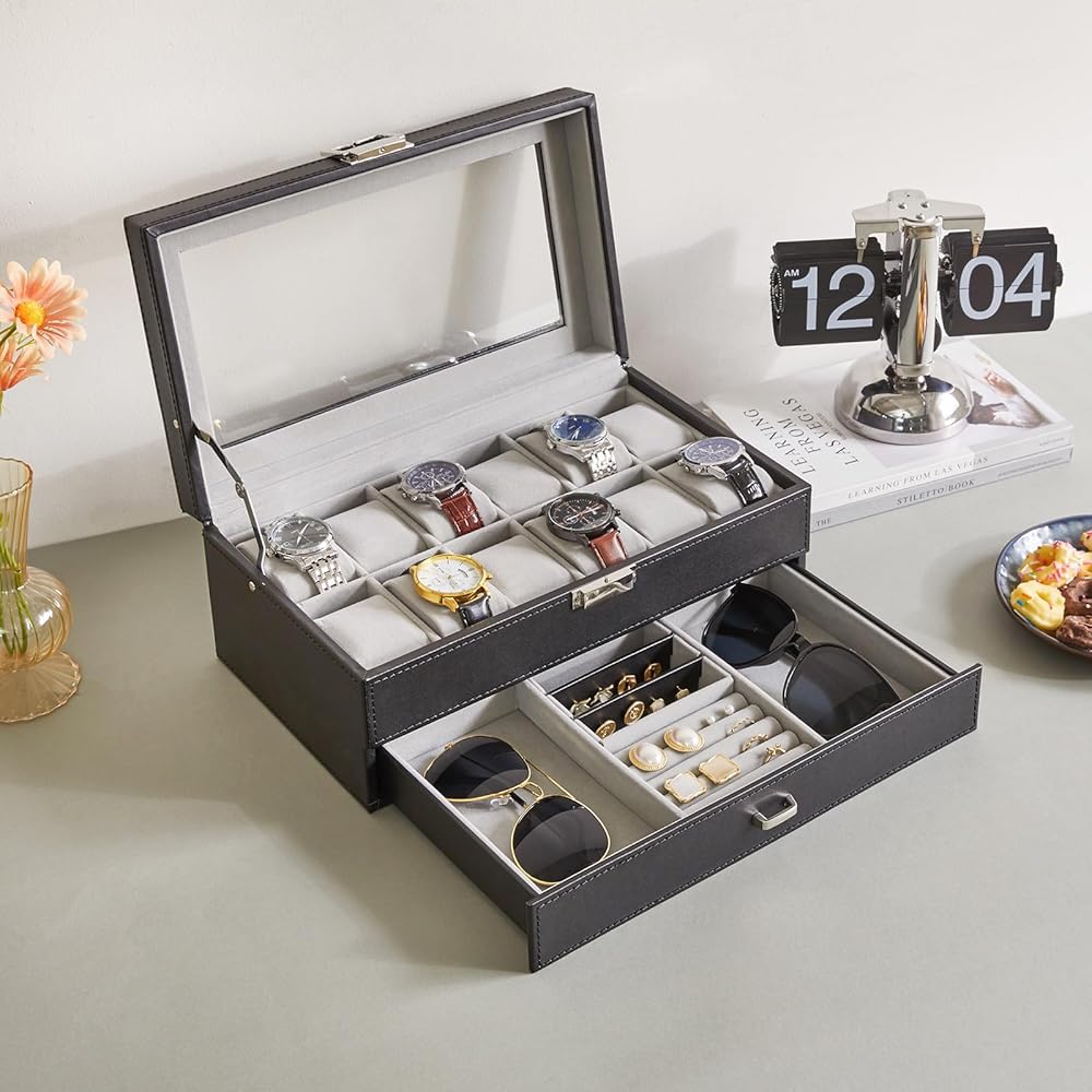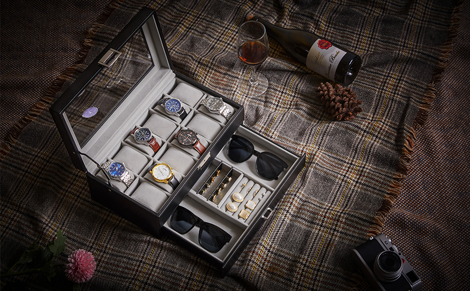 حافظة الساعة والمجوهرات: تصميم مزدوج الطبقات. توفر الطبقة الأولى 12 فتحة، ولها مساحة كافية لحمل الساعات الكبيرة. أما بالنسبة للدرج القابل للسحب، فإن المساحات الموجودة على الجانب كبيرة بما يكفي لاستيعاب الأربطة والنظارات الإضافية. القسم الموجود في المنتصف مفيد للخواتم الصغيرة والأساور والمجوهرات المماثلة؛