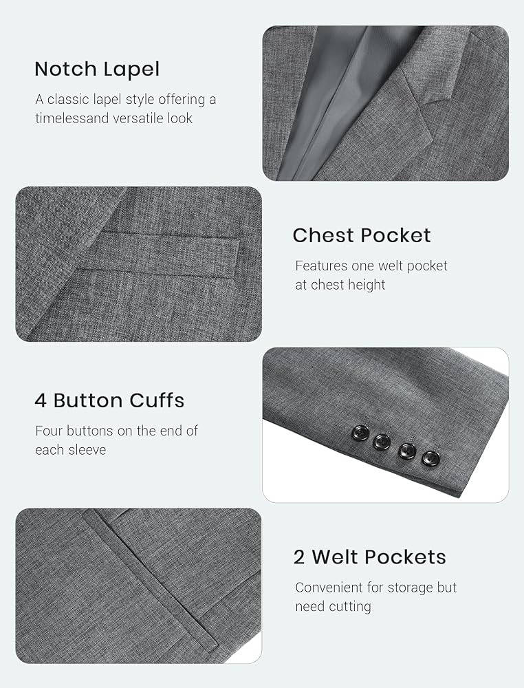 تصميم أنيق: هذه السترات للرجال تتميز ببش صرير بحجم ، وإغلاق زريين , جيوب ويلت ، جيبًا حقيقيًا للصدر الأيسر والجيب الداخلي ، يظهر مظهرًا حديثًا وأنيقًا. يجب عليك إزالة الغرز لفتح الجيوب قبل ارتداء سترات بدلة جديدة.