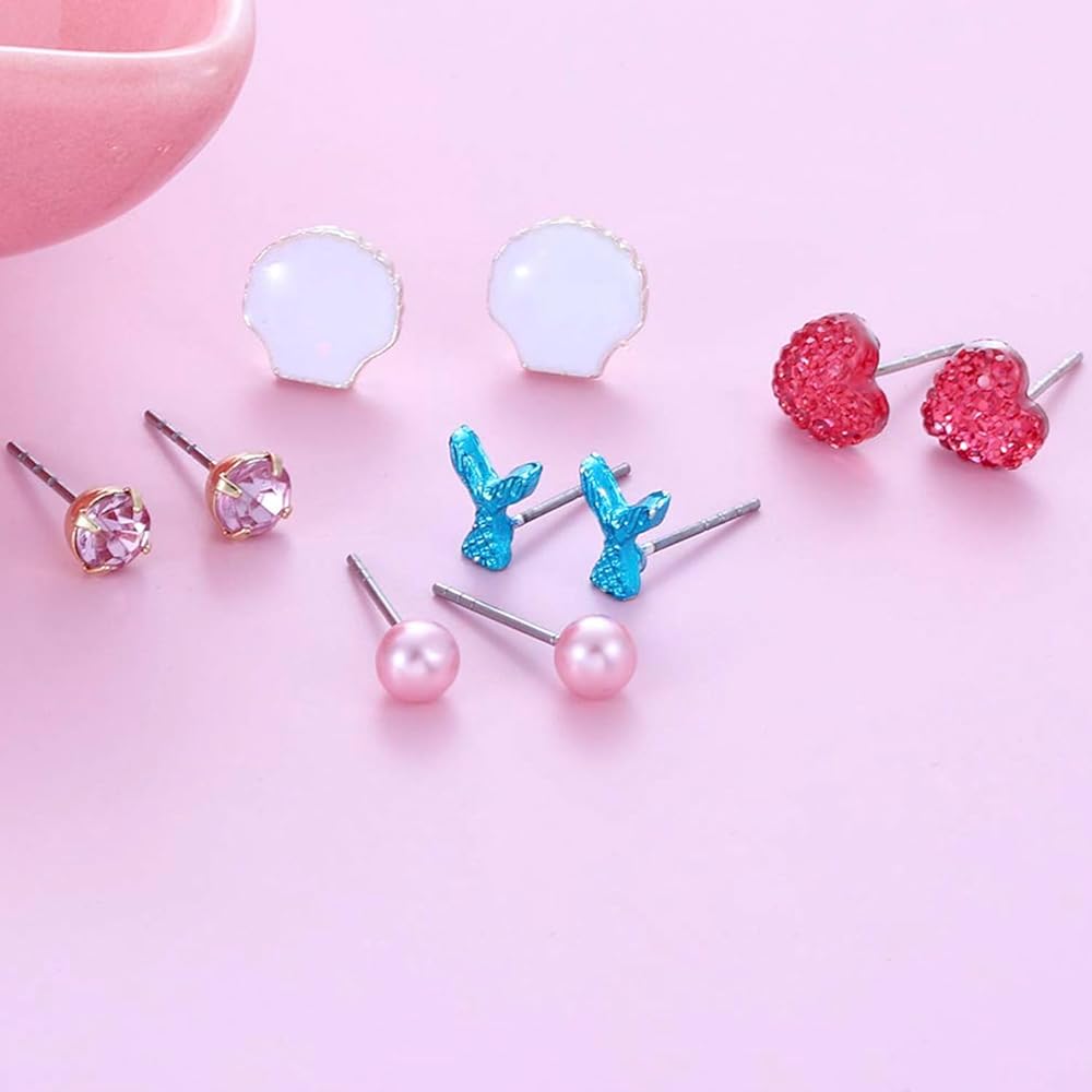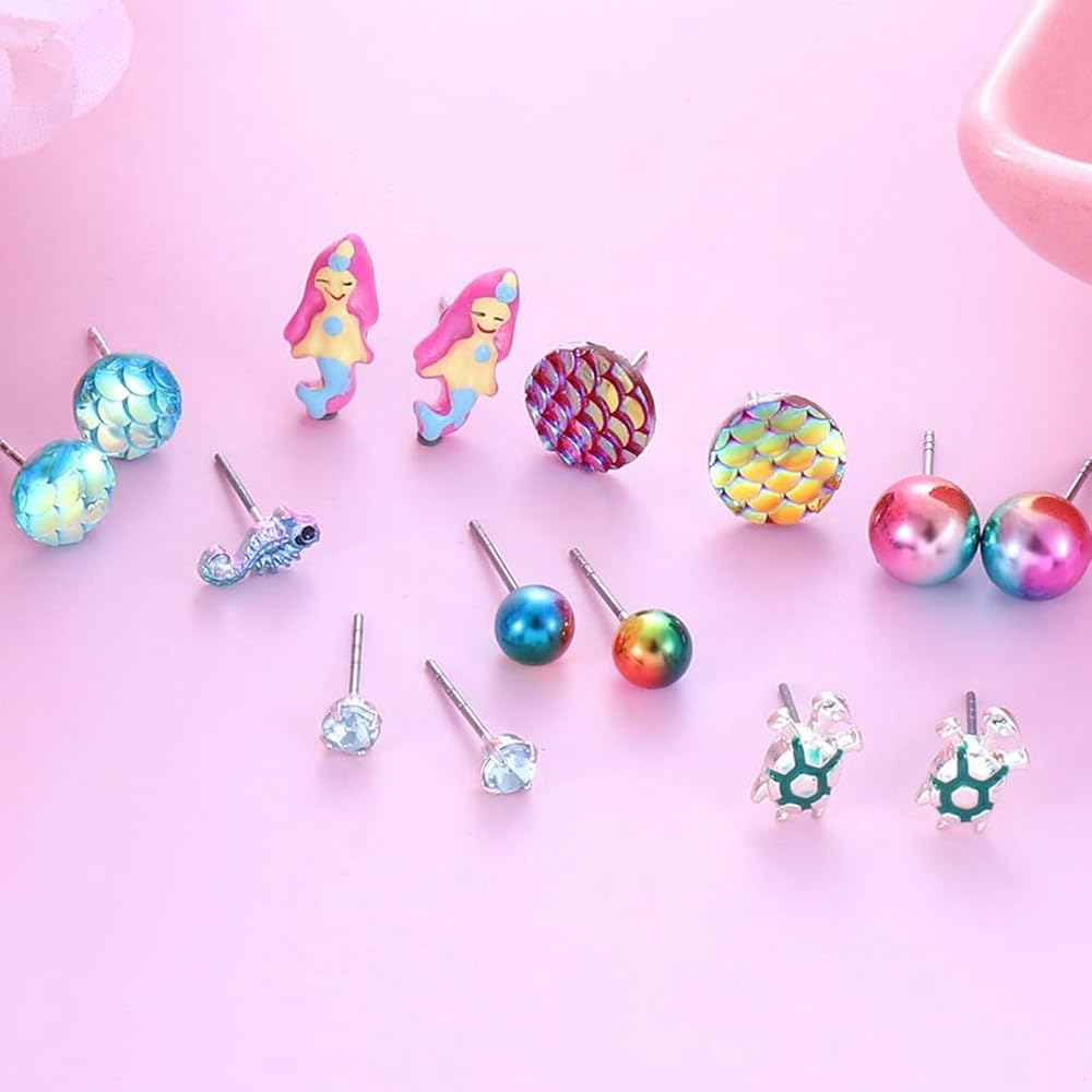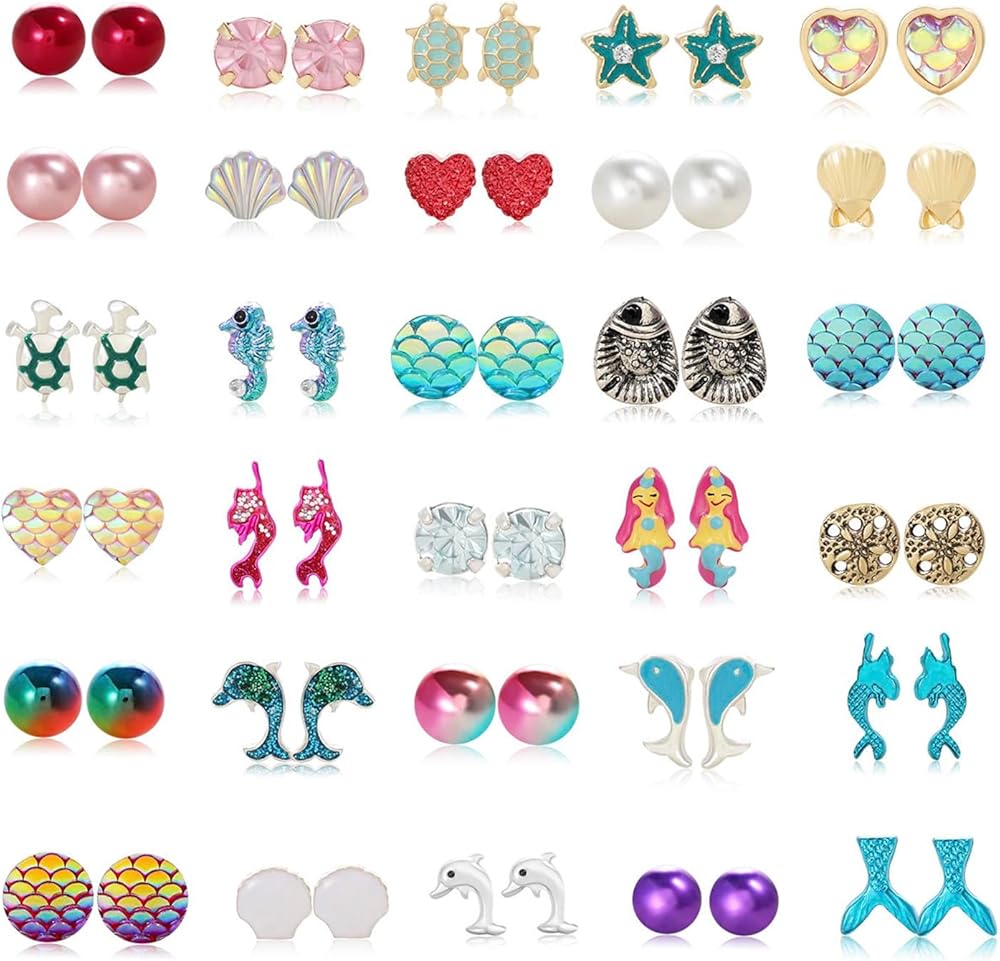 Various Stud Earrings- You will receive 30 pairs of small pierced stud earrings containing pearl ball stud earrings, fishtail earrings, turtle pierced earrings, fish scale earrings, mermaid earrings, dolphin earrings, scallop earrings, seashell earrings, Starfish stud earrings, rainbow-colored ball stud earrings, fish earrings, crystal pierced stud earrings