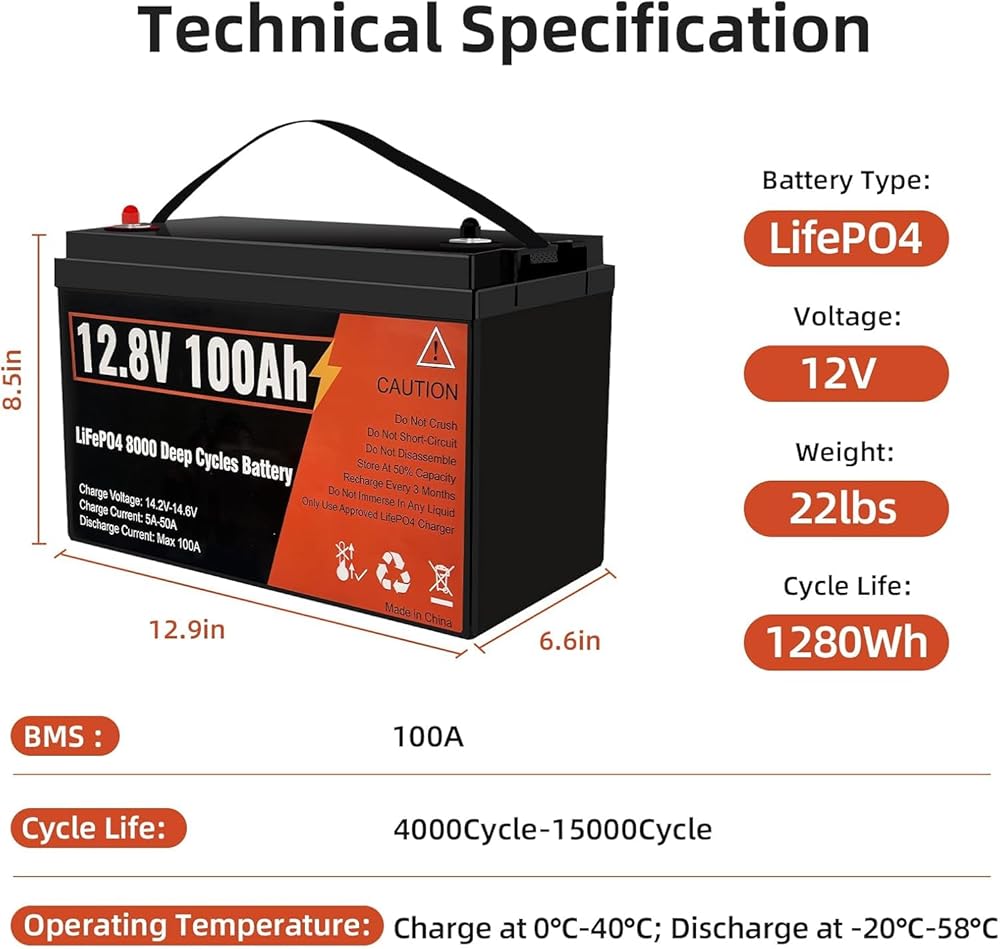 【100A BMS】 LIFEPO4 LITHIUM لها BMS مدمجة تحمي من الإفراط في الشحن والإفراط في الشحن والإفراط في العمل ولديها معدل تفريغ ذاتي ممتاز. يمنع القطع المدمج في درجات الحرارة العالية في شحن درجات الحرارة من تجاوز 50 درجة مئوية. بالإضافة إلى ذلك ، يمكن إعادة شحن البطارية بثلاث طرق ، بما في ذلك شاحن بطارية الفوسفات الحديد الليثيوم (شاحن 14.6 فولت 20A الموصى به مع 5 ساعات فقط من وقت الشحن السريع) ، ولوحة شمسية مع وحدة تحكم ، ومولد (مولد).
