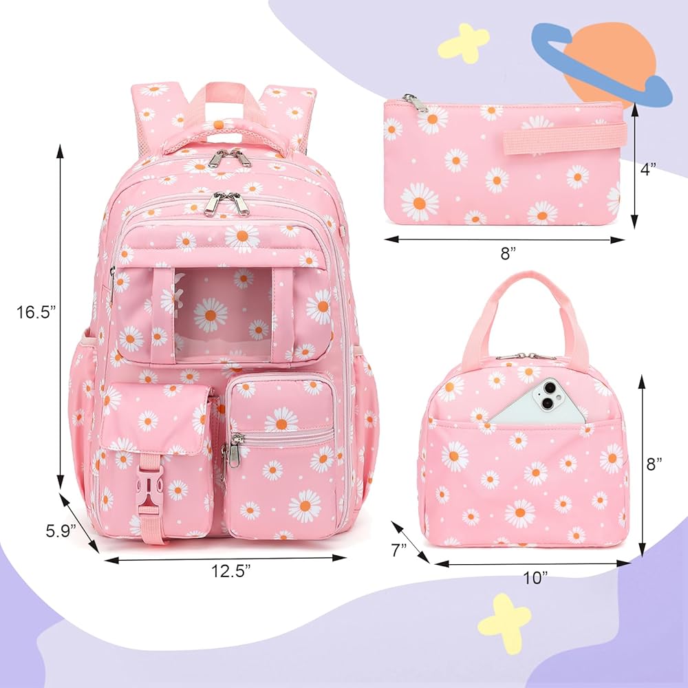 حقائب الظهر للمدرسة الفتيات: 12.5 "x5.9" x16.5 "(l*d*h) ، حجم حقيبة الغداء: 10" x7 "x8" (l*d*h) ، حجم حقيبة القلم الرصاص: 8 "x4" (l*h) ، وتوفير مساحة واسعة لألوانك اليومية.