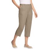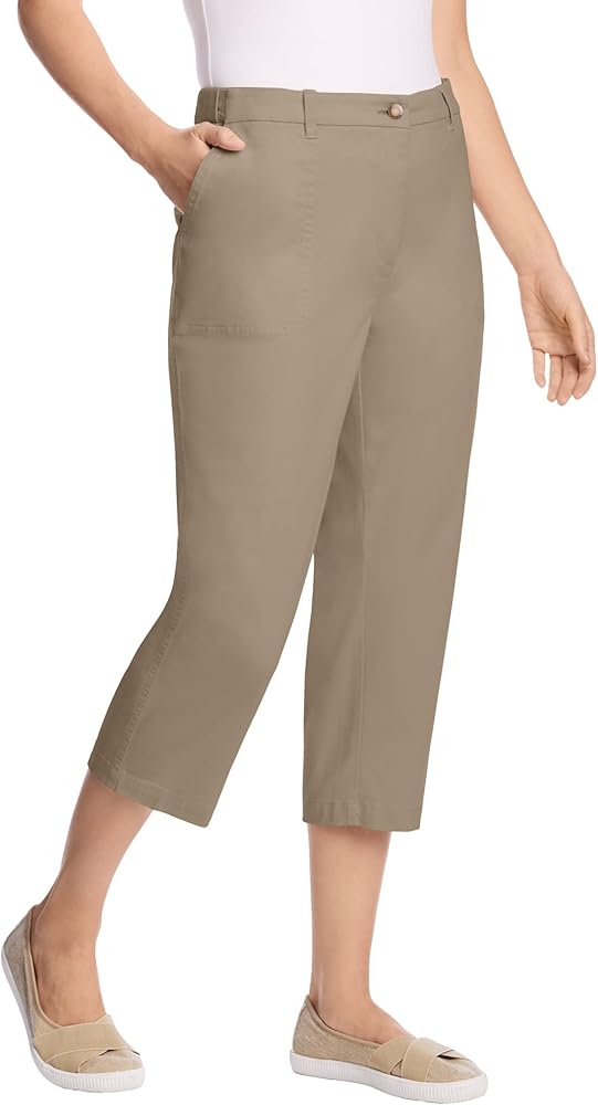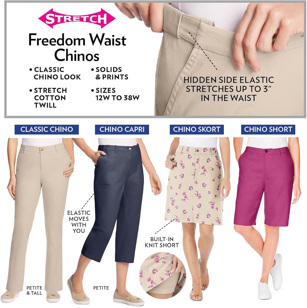Experience ultimate comfort with the Freedom Waist design featuring hidden elastic waistbands that stretch up to 3" on each side. Classic chino capris crafted from stretch twill to ensure ease of movement and all-day comfort. Functional side pockets perfect for carrying essentials. Stylish belt loops for a polished look and versatile styling. Button and zip front closure for a secure and comfortable fit. Available in petite with a 19-inch inseam or average with a 21-inch inseam to find your perfect fit. Made from a durable cotton/spandex blend for a perfect balance of softness and stretch. Easy to care for with machine washable fabric, making these capris perfect for everyday wear. Imported