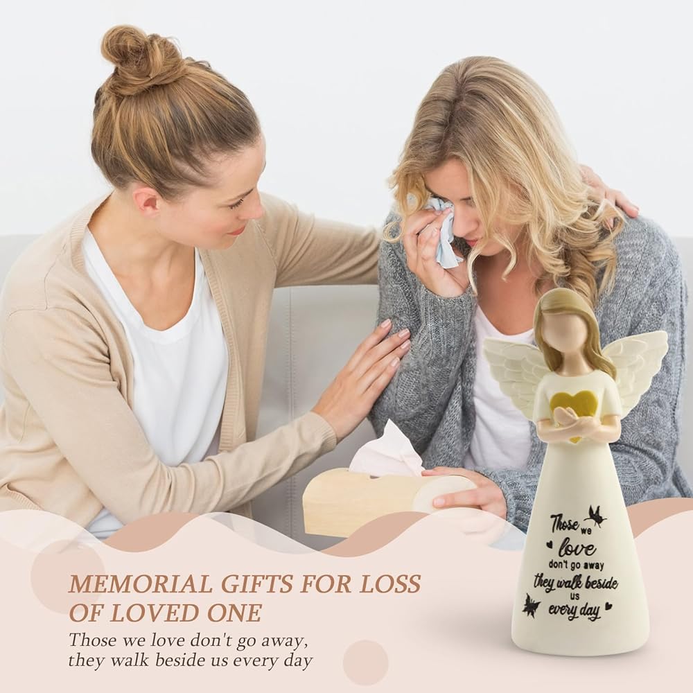 هدية تعاطف فريدة من نوعها: يرتدي شخصية الملاك ذات الراتنجات التي تبلغ مساحتها 5 بوصات مرتديًا فستانًا بلون قشدي مع يديها متقاطعة تحت قلب ورقة ذهبية صغيرة. هذه التماثيل الملاك التي ترمز إلى التعاطف والحب ، هي هدايا تذكارية ، وفكرة هدية الفجيعة ، وهدايا الفجيعة ، وهدايا التعاطف لفقدان أحد أفراد أسرته