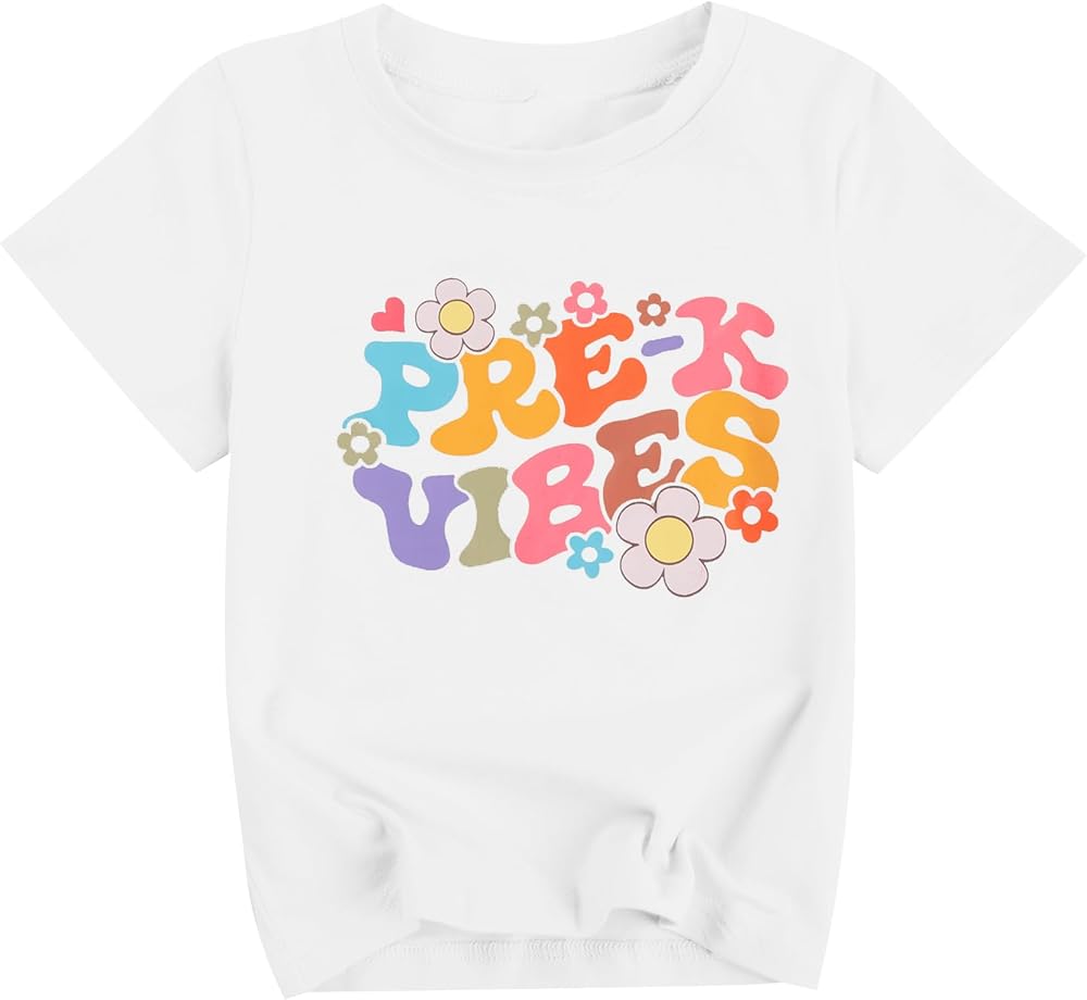 العبوة: 1*طباعة زهور على شكل وجه مبتسم لطيف، قميص علوي للفتيات مطبوع عليه حروف Pre-K.