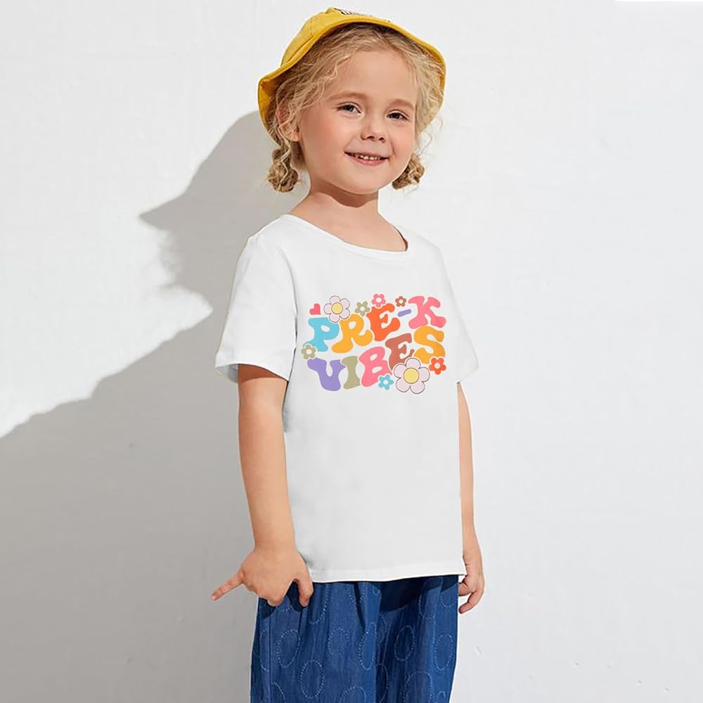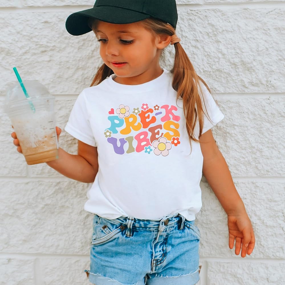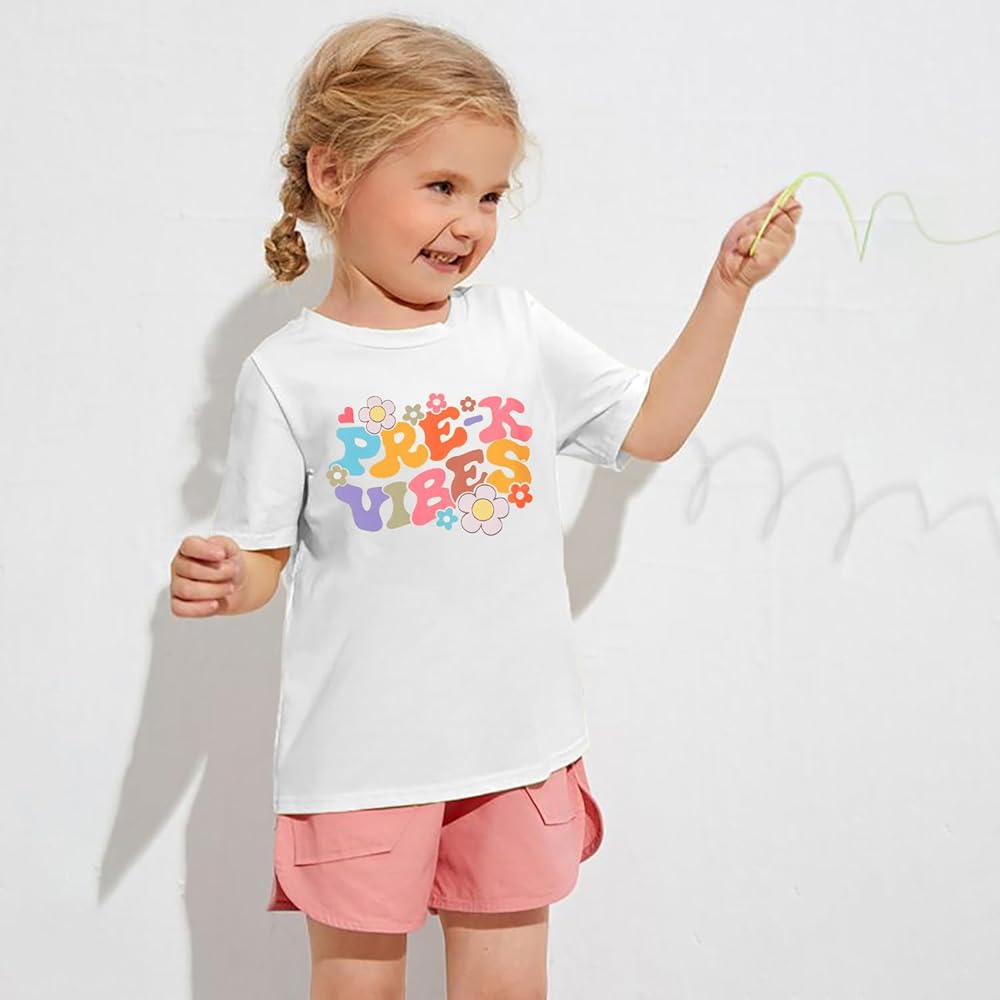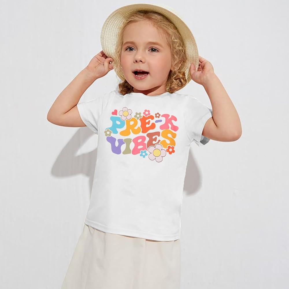 المزايا: قمصان ما قبل المدرسة بطباعة حروف لطيفة، قمصان رياض الأطفال للفتيات، قميص برسومات زهور مرحة للفتيات الصغيرات، قميص العودة إلى المدرسة للأطفال الصغار، قمصان العودة إلى المدرسة للفتيات، تي شيرت اليوم الأول للمدرسة، قمصان للفتيات في مرحلة ما قبل المدرسة.