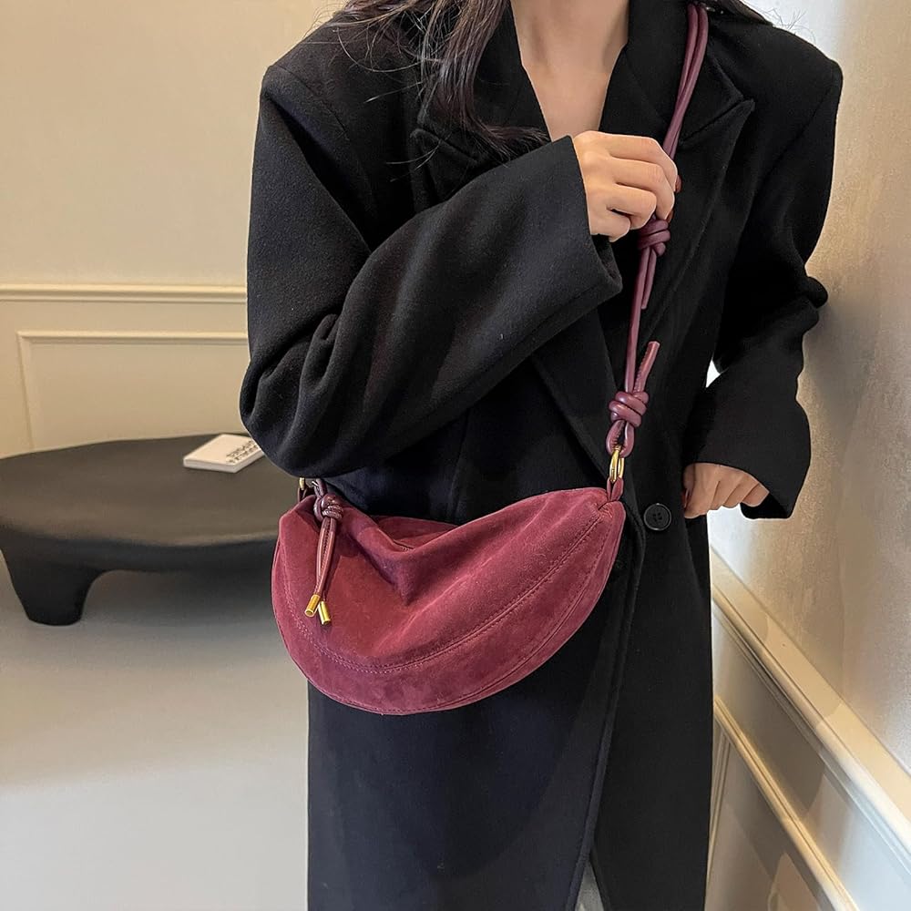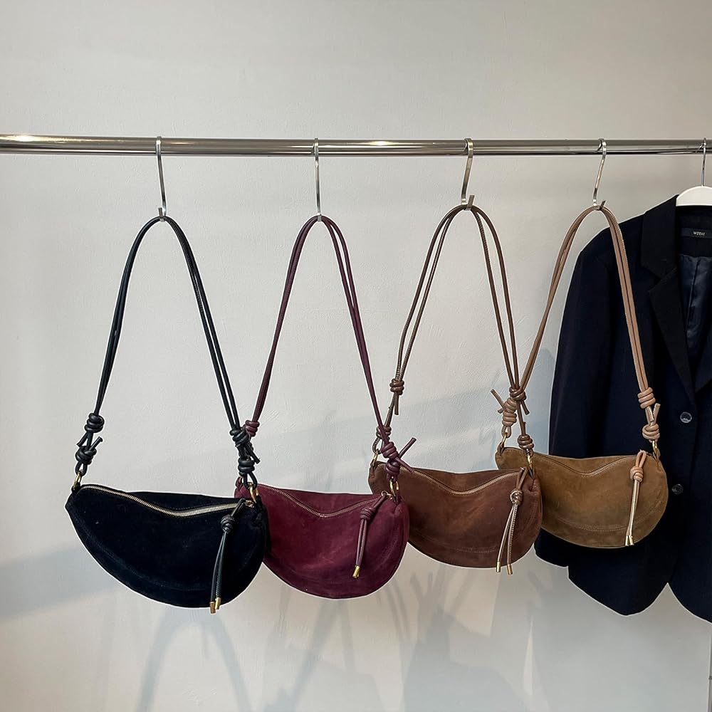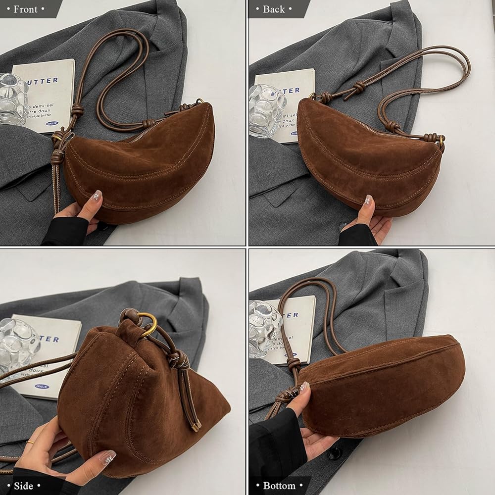 التصميم: حقيبة حمل من جلد الغزال هذه مصنوعة من مواد من جلد الغزال الناعمة ولديها تصميم شكل هلال ، وهو من المألوف ولطيف ويمكن مطابقته مع أي جماعة ، مثل التنانير ، الجينز ، القمصان ، إلخ.