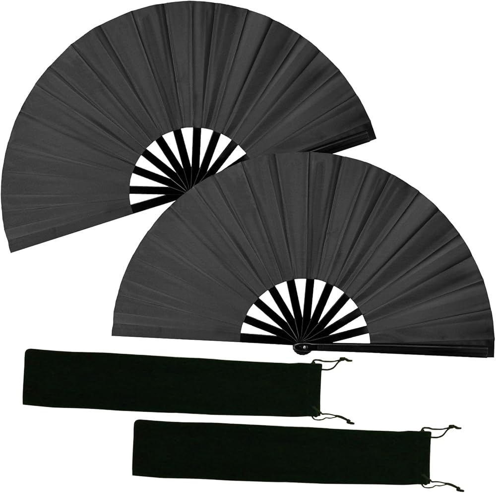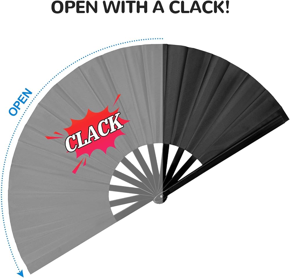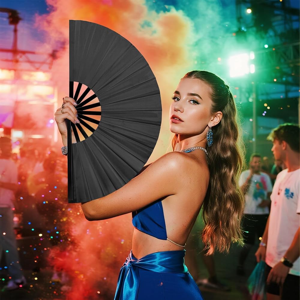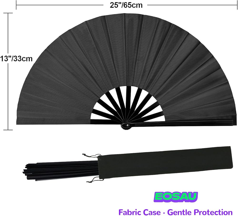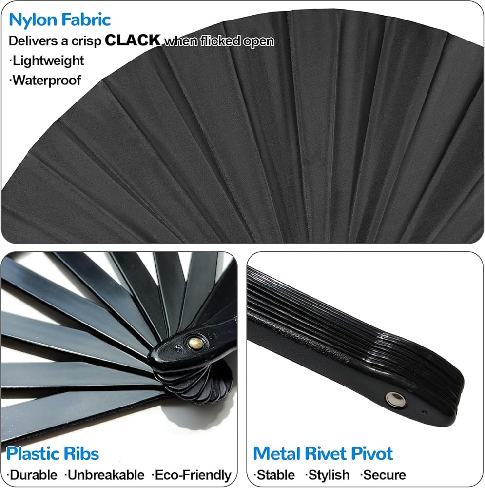 This 100% handmade large folding rave fan is crafted with sturdy plastic ribs and durable water-resistant nylon fabric, ensuring easy opening and closing while resisting breaking and fading for long-term use. Easy to use, it opens to 25 inches (65 cm) for a dramatic effect and closes to 13 inches (33 cm) for convenient portability, producing a loud “CLACK” sound when opened to keep you cool in hot weather. The minimalist black design elevates your performance or event attire, adding charm and character to your performance and helping you stand out in the crowd. As the perfect rave accessory, it's ideal for music festivals, EDM parties, carnivals, concerts, cosplay, dancing, stage performances, and more—suitable for both men and women. It also makes a unique gift, including a foldable fan and a flannel storage bag for easy carrying and protection, perfect for birthdays, holidays, and special occasions like Halloween, Christmas, and Valentine's Day.