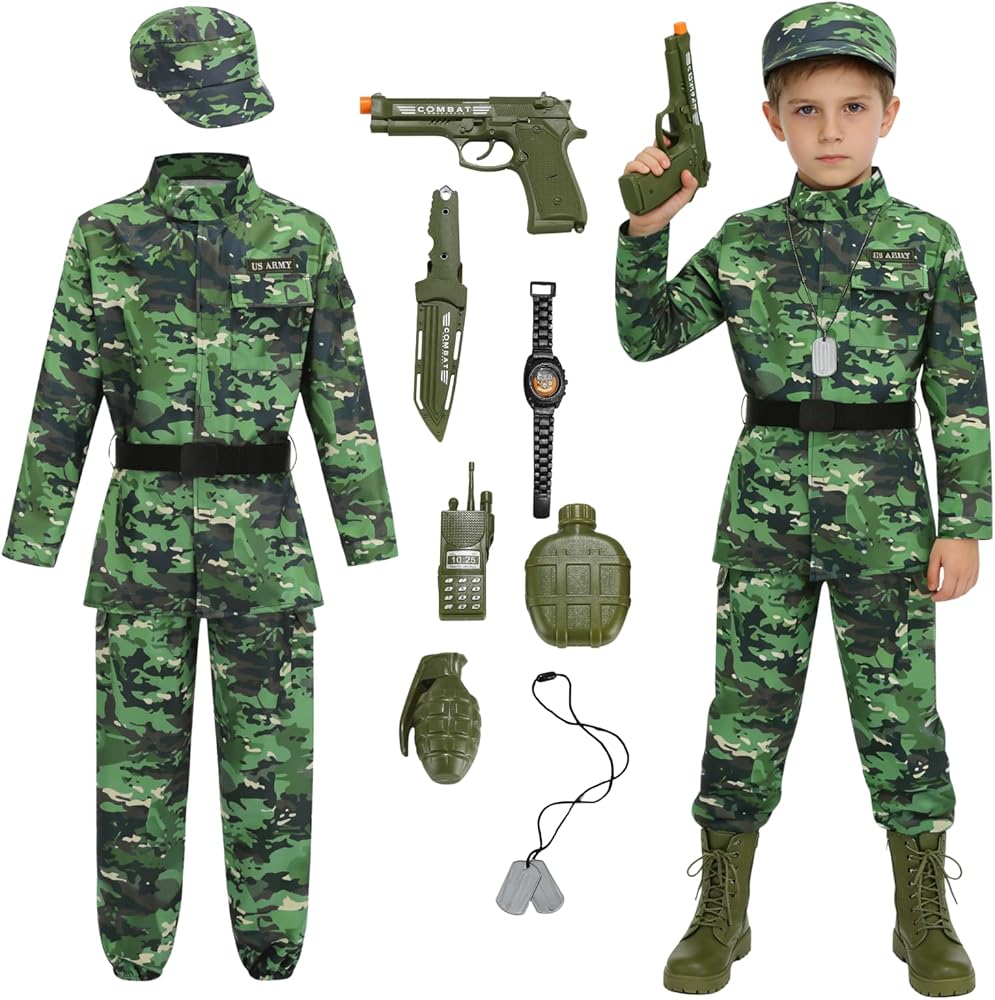 11 PCS Army Costume: 1 Camo Jacket ، 1 Camo Pants ، 1 Camo Hat ، 1 BLACK BELL ، 1 WATCH ، 1 Walkie-Talkie ، 1 Mini Mater Bottle ، 1 Tag Necklace و 3 Tary Toys