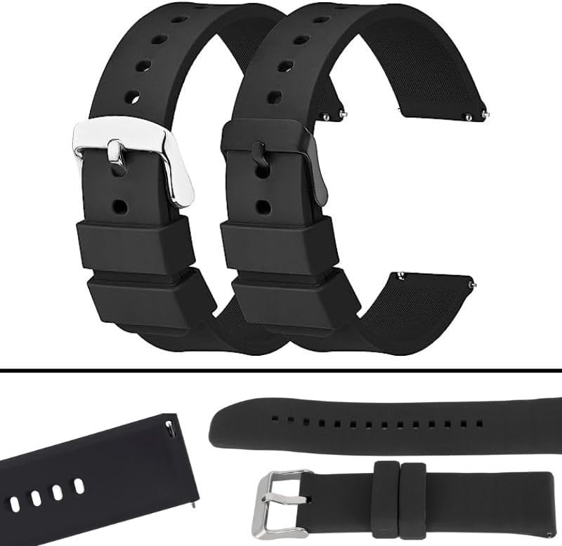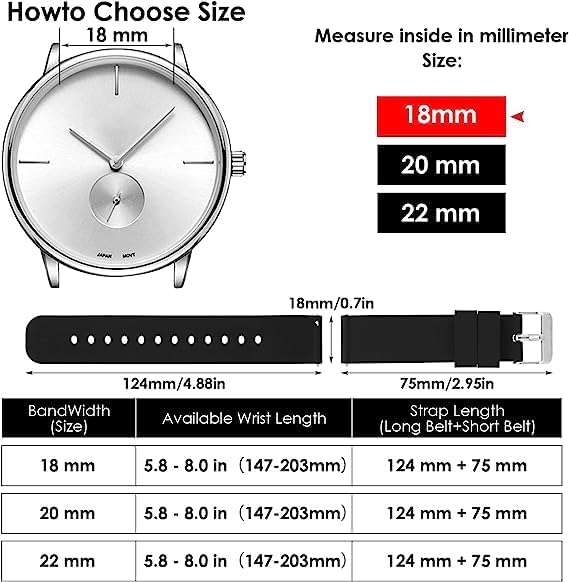 Silicone watch replacement strap Packing list: 1PCS black buckle + 1PCS silver buckle Band size: 5.7 inches to about 8 inches wrist, Length: 212mm/8.34 inches, Width: 18mm/0.7 inches, Thickness: 9mm/0.35 inches. (for 18MM) After-sales service: If you have any questions, please contact us, we will reply you within 24 hours. We will provide after-sales service in time, please rest assured to buy