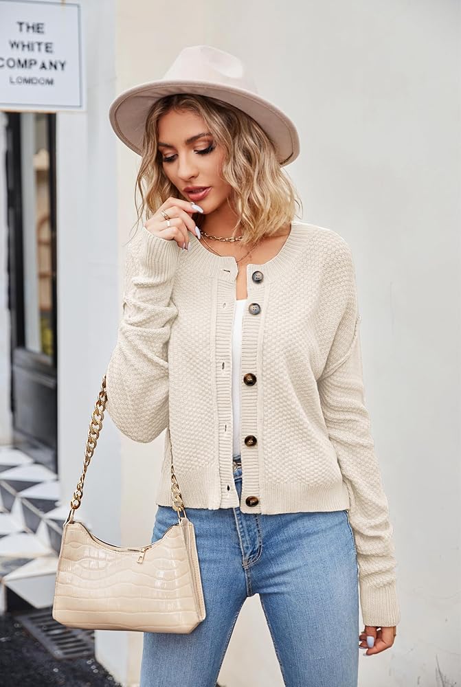 خامة مريحة: السترة الكارديجان مصنوعة من نسيج صديق للبشرة وناعم وجيد التهوية، 100% أكريليك. السترة ليست سميكة جدًا أو رقيقة جدًا، مثالية للأشهر وأيام الخريف الباردة