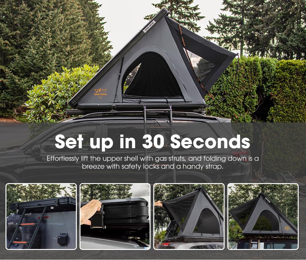 Slimline yet packed with adventure, our Hotham Lite is the more nimble sibling of the Hotham series RTTs. Whether you're an urban explorer or a backcountry adventurer, it offers a streamlined pack-down and lightweight design—delivering the best of both worlds—comfort and ease of use, all without the bulk. At just 4.57 inch in height when packed down, the Hotham Lite makes undercover parking and tight garage spaces a breeze. And at only 128.97 lbs--an impressive 32% lighter than the Hotham--it's easy to handle and can be installed even on a compact SUV. Crafted from 420D Oxford Fabric and 280GSM Polyester-Cotton, it boasts 5,000mm waterproofing and UV 50+ protection, offering exceptional durability in the harshest conditions. Inside, you'll find a spacious 81.49 in x 46.06 in sleeping area with a ceiling window that invites natural light and breeze. The built-in LED light also allows you to set the perfect mood. Experience outdoor living at its finest with the San Hima Hotham Lite!