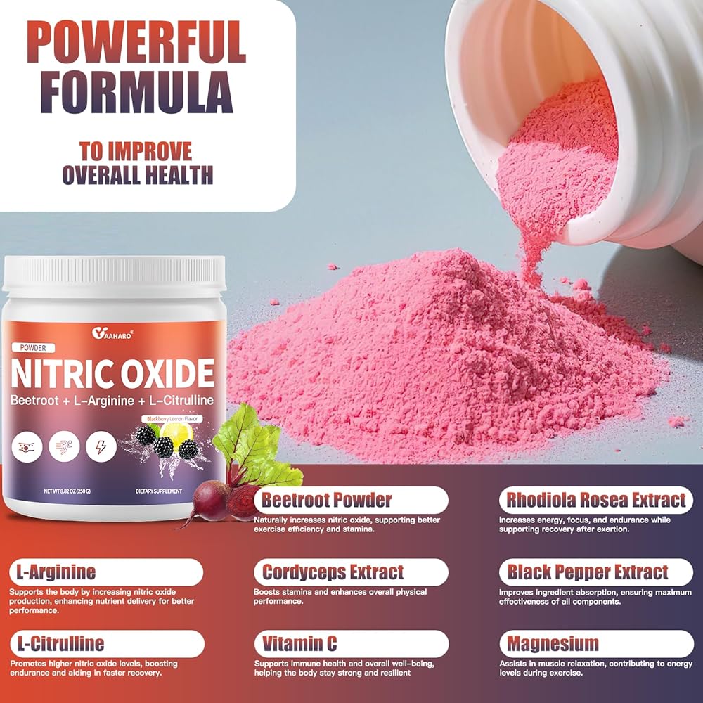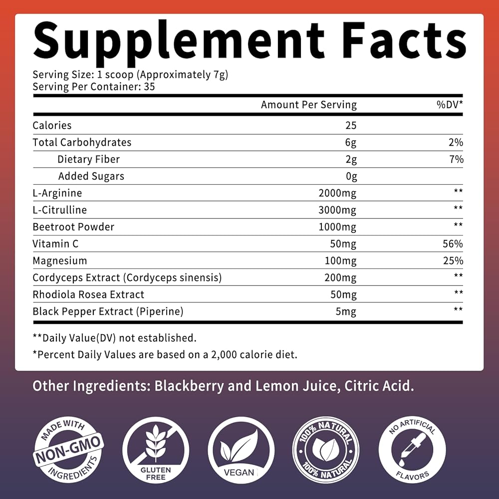 مكمل أكسيد النيتريك - مسحوق جذر البنجر مع إل-سيترولين وإل-أرجينين، مكملات أكسيد النيتريك للرجال والنساء مع الشمندر، يدعم الطاقة، صحة القلب، نكهة ليمون بلاك بيري، كمية تكفي 35 يومًا