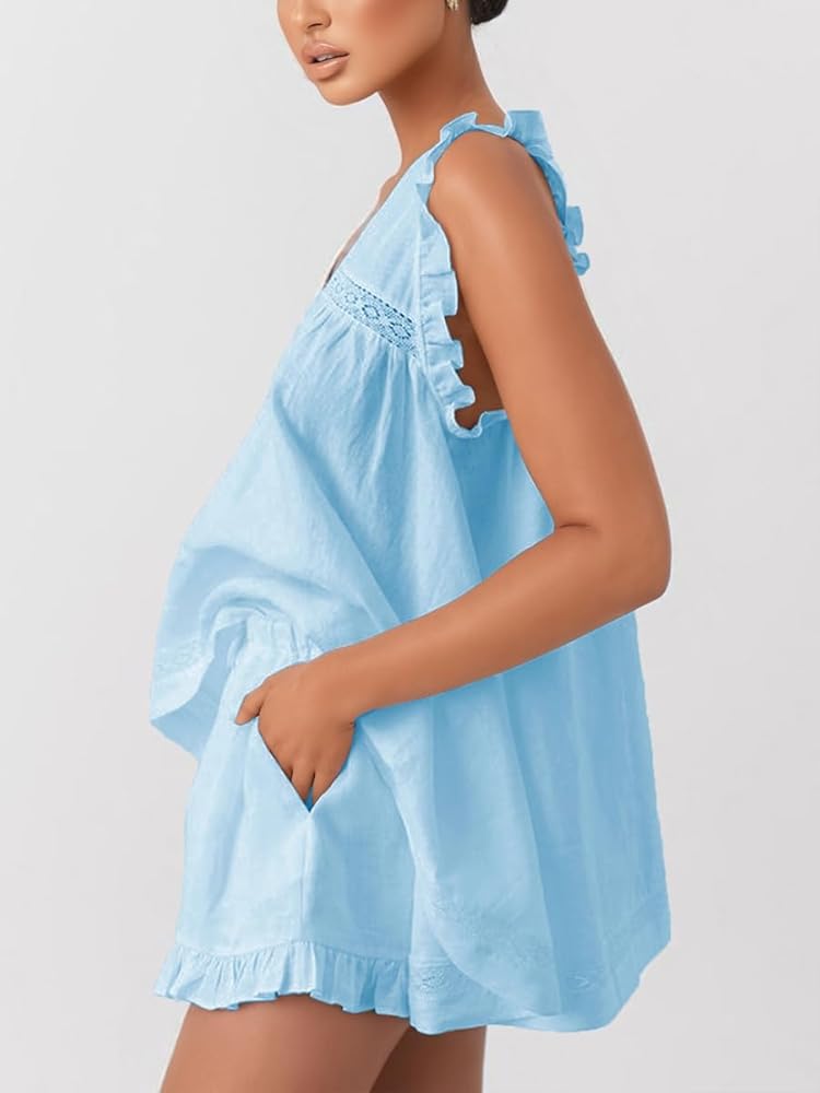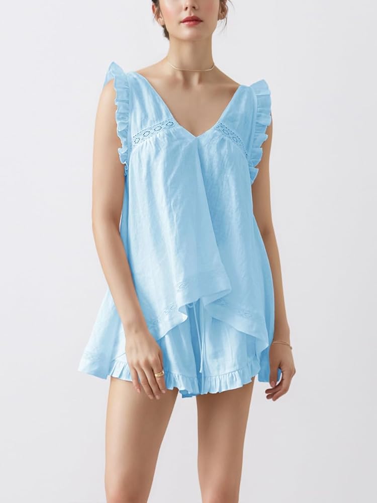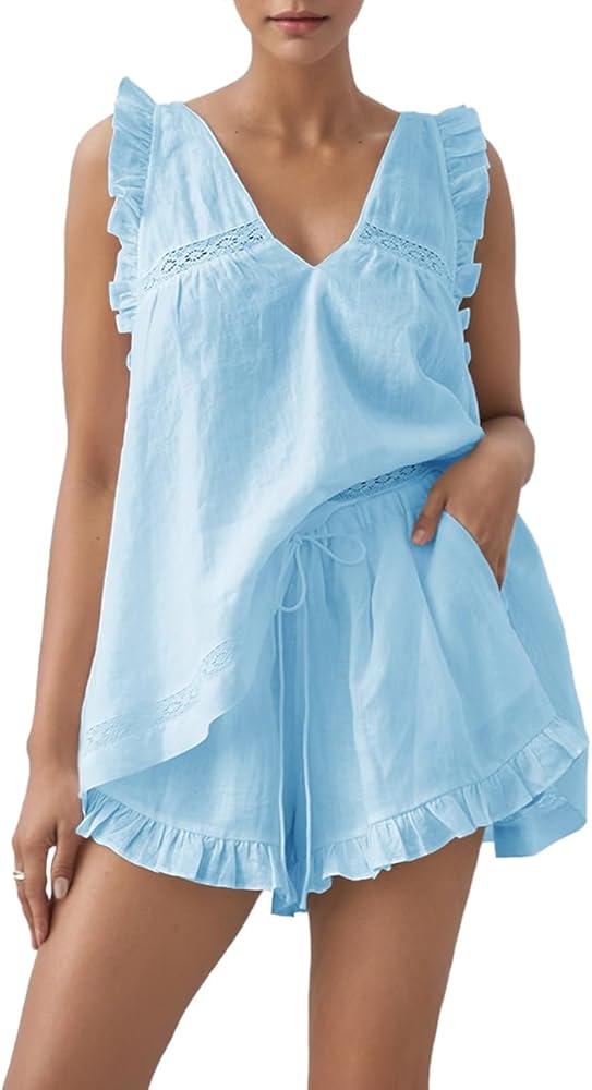 التصميم: تتميز مجموعات الصالة بملاءمة على الطراز المريح ، والأعلى مع رقبة من الدانتيل المصنوعة من الدانتيل ، وظهر منخفضة مع ربطة عنق في الرقبة ، و hemline مريحة ، ولون صلب ، ومناسب لأي نوع من أنواع الجسم. يتميز السراويل القصيرة بخصر مرن عالي ، تنحنح كشكش ، جيوب جانبية عملية ، مثل هذا المظهر اللطيف والأنيق الذي لا يخرج عن الأناقة.