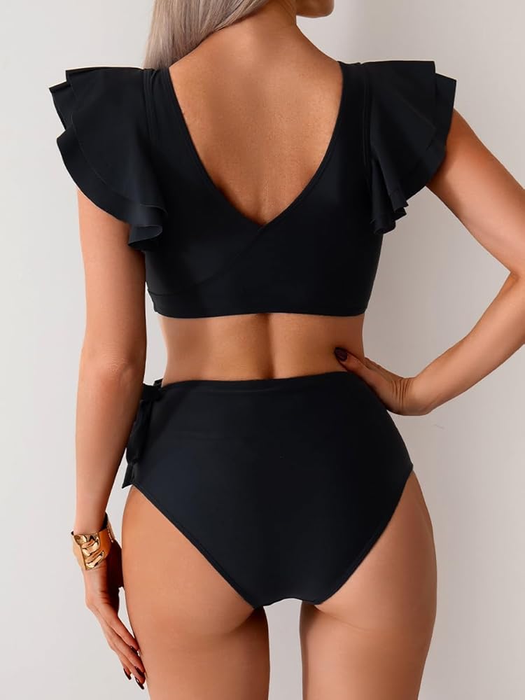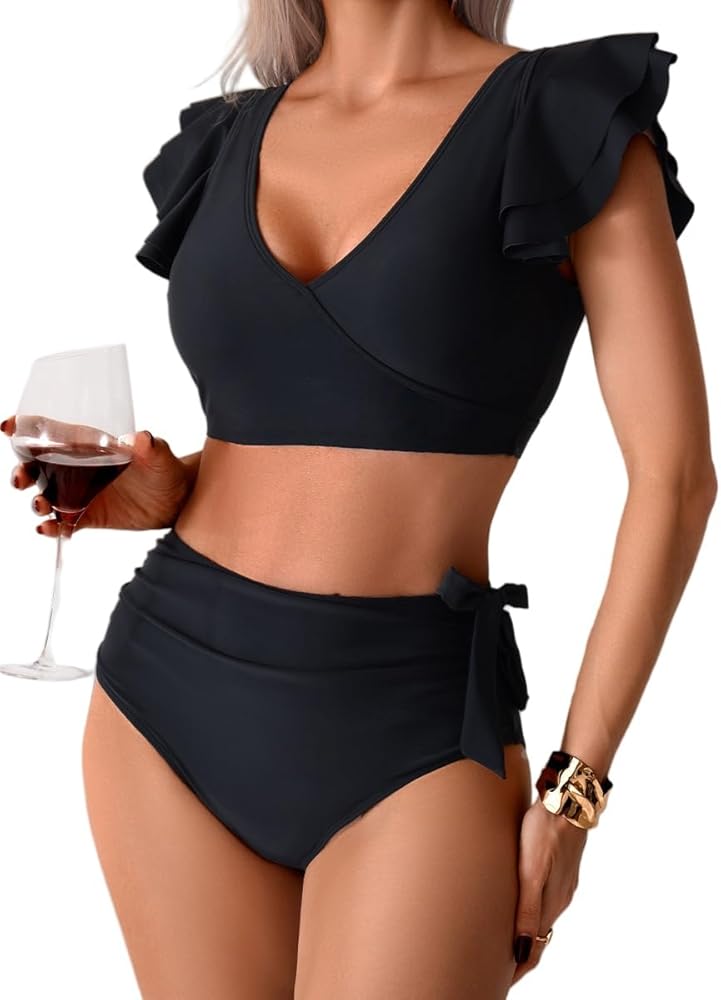 التصميم العصري والمحافظ: تجمع هذه السباحة المكونة من قطعتين بين الأناقة والتواضع ، والتي تتميز بقاع عالي مخصر ولهجة قوس مكثفة تضيف لمسة من الأناقة مع توفير تغطية كاملة.