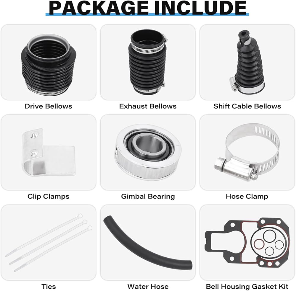 - تشمل الحزمة: 1pc U-joint bellow 816431a1 ، 1pc خرطوم المياه 3/4 "32-41725-33 ، 1PC كابل التحول 74639 ، 1PC العادم Bellows 18654A1 ، 1PC Gimbal Bearing 30-60792A4 ،