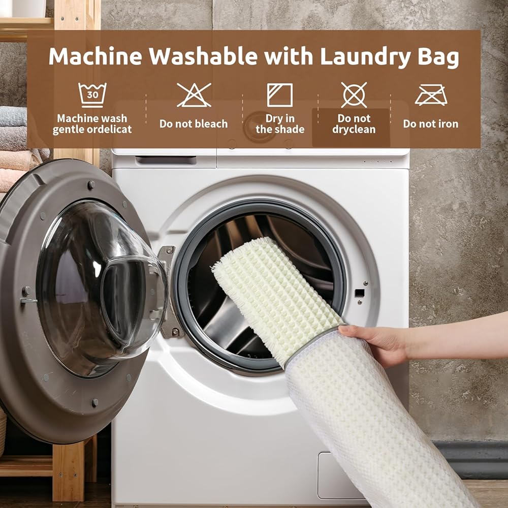 • سهلة رعاية غسل الماكينة: التنظيف هو نسيم! ما عليك سوى وضع سجاد الحمام القابل للغسل في الماكينة في كيس غسيل واغسله على دورة لطيفة بالماء البارد. تجنب درجات الحرارة العالية لتقليل تقلص. يجف الهواء بشكل طبيعي - لا يجف - للحفاظ على جودة البساط وطول العمر.