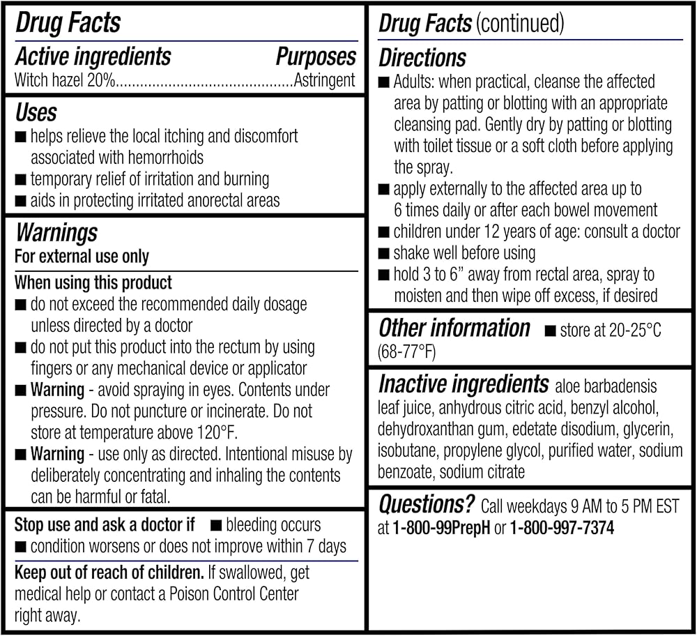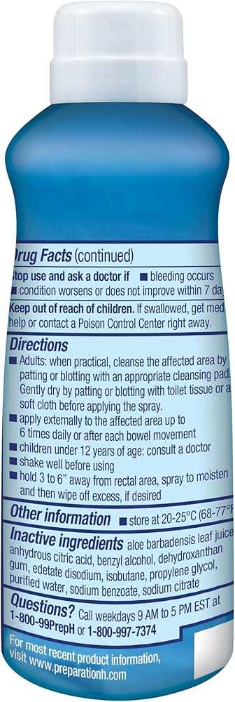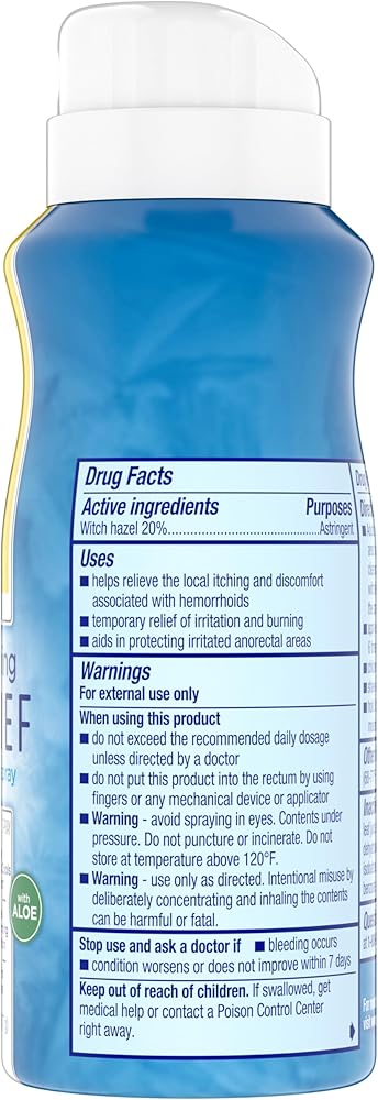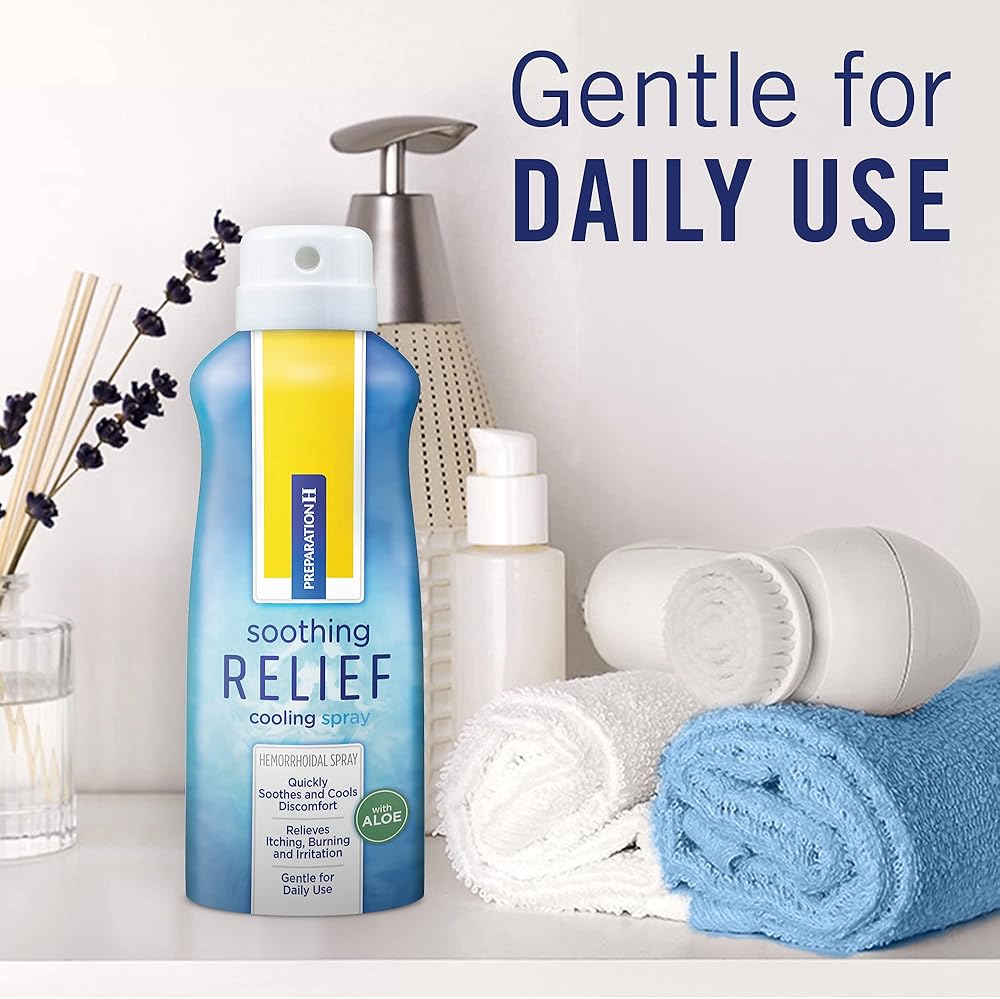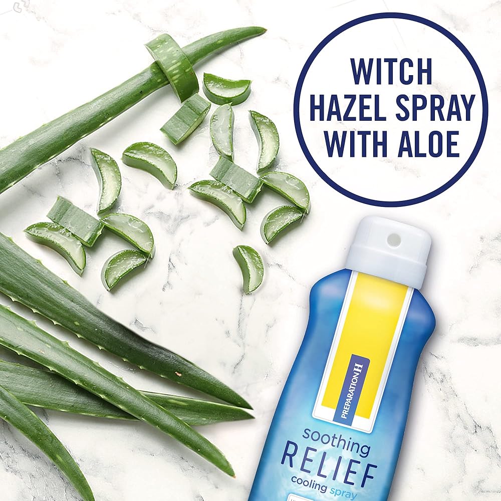 Preparation H Soothing Relief Cooling Spray soothes and cools irritated skin, offering fast, targeted relief of burning and itching caused by hemorrhoids. Even mild irritation around the butt can be an uncomfortable and persistent problem. When other treatments aren't providing the comfort you need, this witch hazel spray provides quick and easy irritated skin relief that is gentle enough for daily use. Conveniently non-messy, this soothing skin spray is easy to apply at any angle without touching the irritated area. Take this portable witch hazel spray bottle with you for relief on the go. This spray is the newest addition to our Soothing Relief line, which also includes Preparation H Soothing Relief Cleansing and Cooling Wipes to calm burning and provide hemorrhoid itch treatment on contact. From the leader in hemorrhoid treatment, this Preparation H hemorrhoid spray helps you feel fresher and more comfortable, with less irritation.