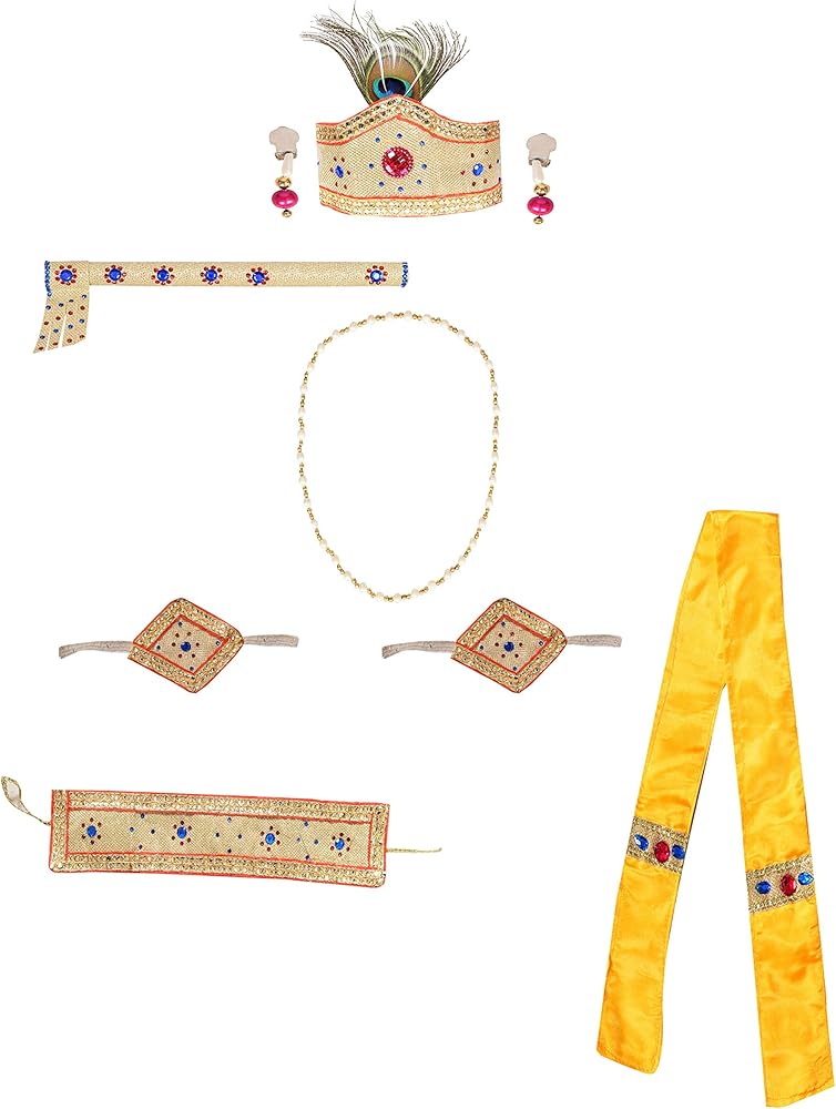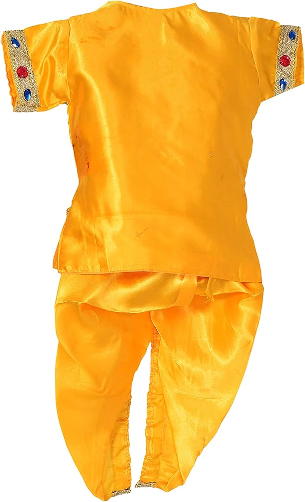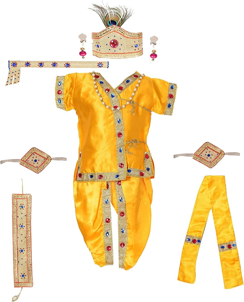 فستان كريشنا من الساتان الأصفر البلاتيني من Ahhaaaa، مصنوع من الساتان الأصفر عالي الجودة مطرز يدويًا كورتا دوتي مع إكسسوارات (باندي، باتكا، موكوت مع ريش الطاووس، باجوباند، حزام، مالا، كوندال، وبانسوري/فلوت.