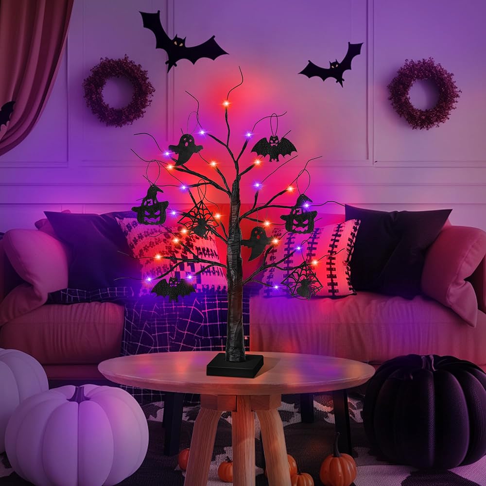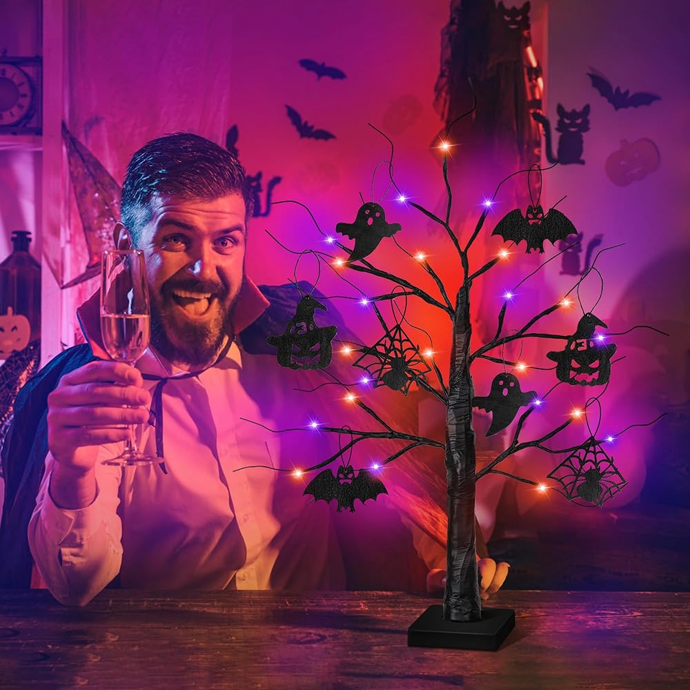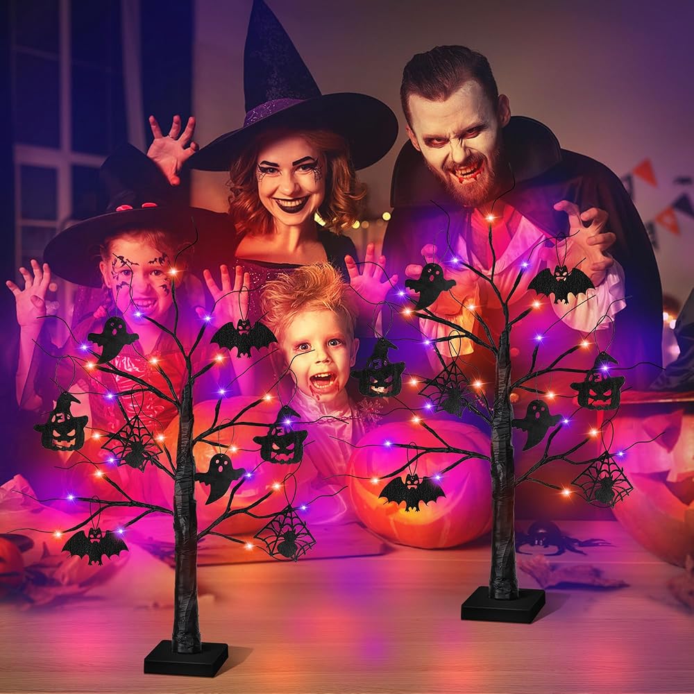 ديكورات الهالوين الداخلية 2 حزمة 24 بوصة شجرة هالوين سوداء مع 24 LED الأضواء الأرجواني البرتقالي ، USB/بطارية تدير الهالوين زخارف شجرة ضوء الشجرة مع مؤقت ، مخيف مخيف المنزل ديكور