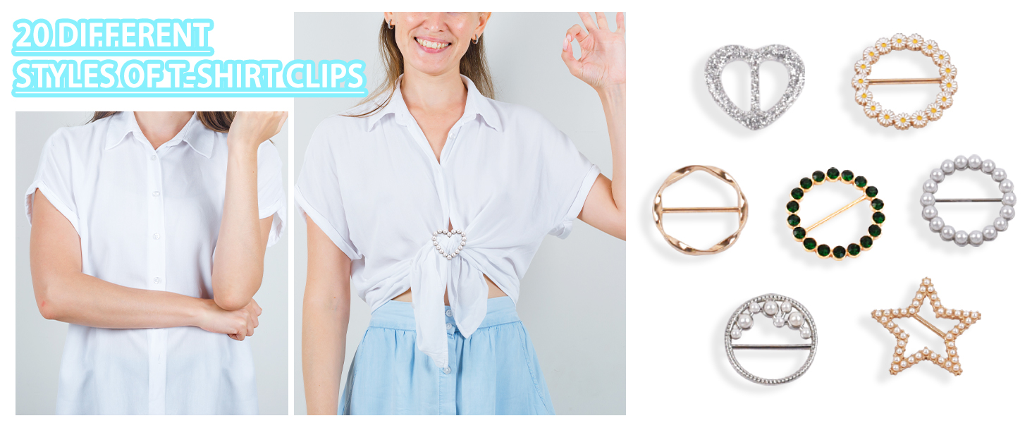 PACKAGE CONTENTS AND 20 STYLES: You will receive 20 different styles of t-shirt clips, the smallest heart clips are for thin garments, the largest ring clips are for thicker garments, and the medium t-shirt clips with pearls can be used as fashionable decorations for women's accessories. Enough to meet your different needs and replacement requirements, you can easily choose according to your personal preferences.