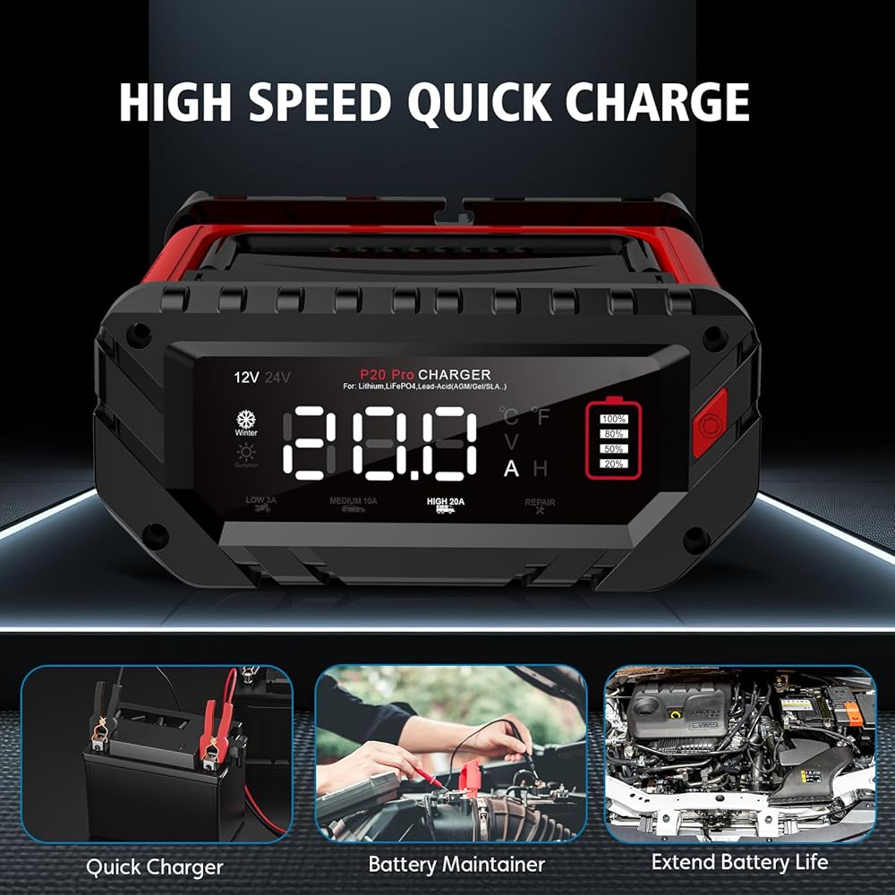 🚗🏍 شاشة Large: من السهل التعامل مع مجموعة متنوعة من بيئات الجهد القاسية. ستتوقف تلقائيًا عند شحن البطارية بالكامل. يمكن أن تعرض شاشة LCD الكبيرة لشاحن الشاحن الجهد والتيار ، والبطارية ، ودرجة الحرارة ، وما إلى ذلك ، يمكنك تشغيل الشاحن بسهولة.