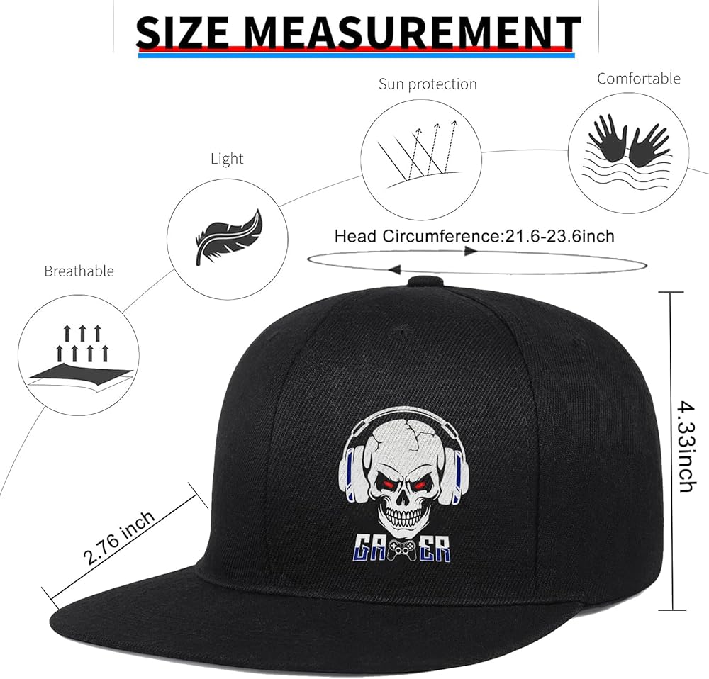 This is a men's skull skeleton finger rose flat bill baseball cap made of polyester twill, One Size Fits For 21.65"-23.23" Head Circumference/Brim: 2.76 Inch/High:3.54 Inch.This adorable and classic cap is perfect cap for anywhere you go.You Can Use This Skull Finger Flat Bill Hat For Your Usual Day-To-Day Activities.
