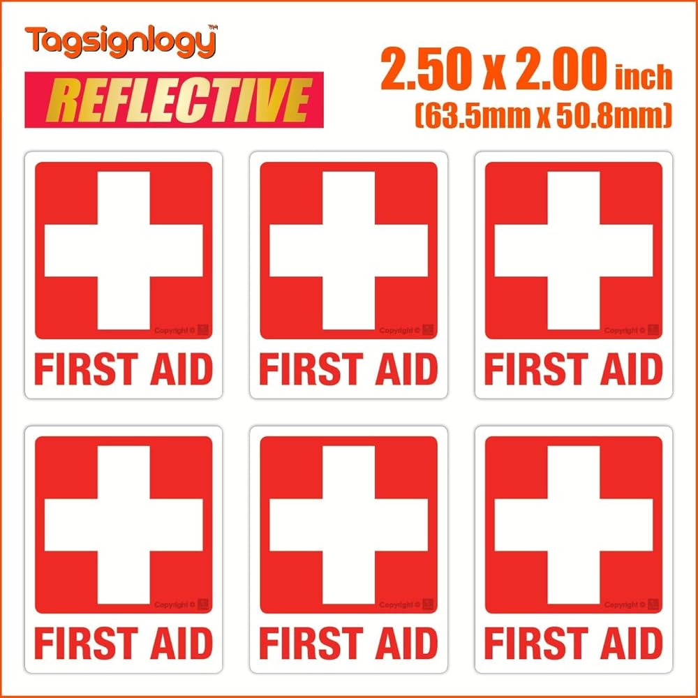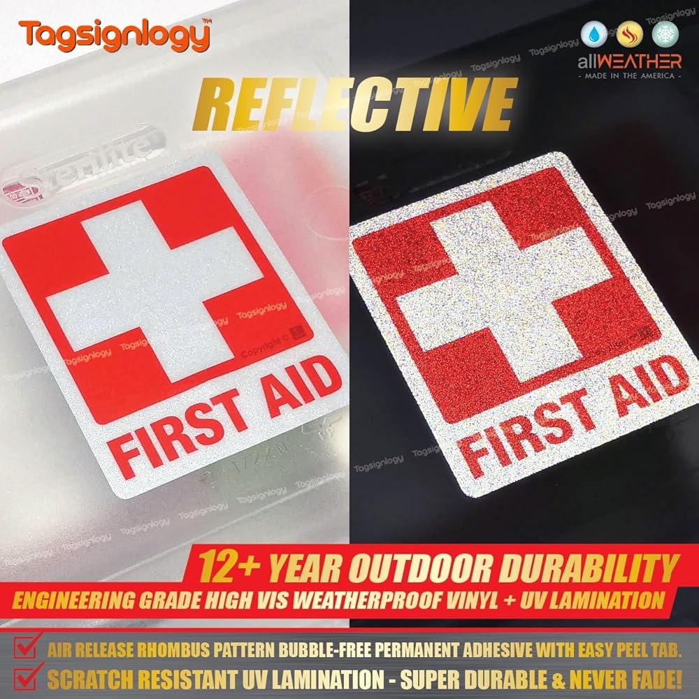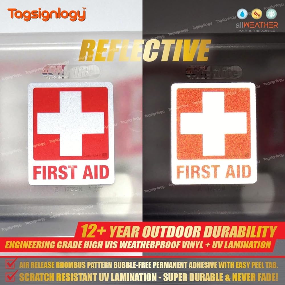 [عاكس] الإسعافات الأولية للأشعة فوق البنفسجية ملصقات الفينيل المقاومة للطقس (6 أجهزة كمبيوتر) (2.50 × 2.00 بوصة) درجة عالية من مهندس الرؤية [ضمان مقاوم للبلاغ لمدة 12 عامًا] علامة سلامة مربع الطبية