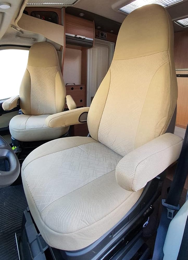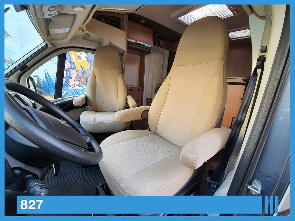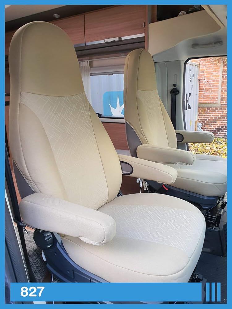 Dimensions seat covers for caravans. Box contents: complete seat cover set for 2 single seats (driver and passenger side), 2 x single seat covers (2 pieces), 4 x universal armrest covers, armrest covers, only suitable for the following dimensions: length approx. 36 cm. Height: approx. 8 cm. Depth: approx. 6 cm. Also suitable for seats with straps without much effort. Loosen the straps on the seat, a small incision in the cover with the scissors, cover and attach the strap again. Back up to half covered. High-quality, very durable fabric from the automotive industry, comparable to the original quality. The fabrics are from the automotive industry with an approx. 4-5 mm foam lamination. Slight colour variations possible due to different monitor settings and lighting conditions when taking photos. !