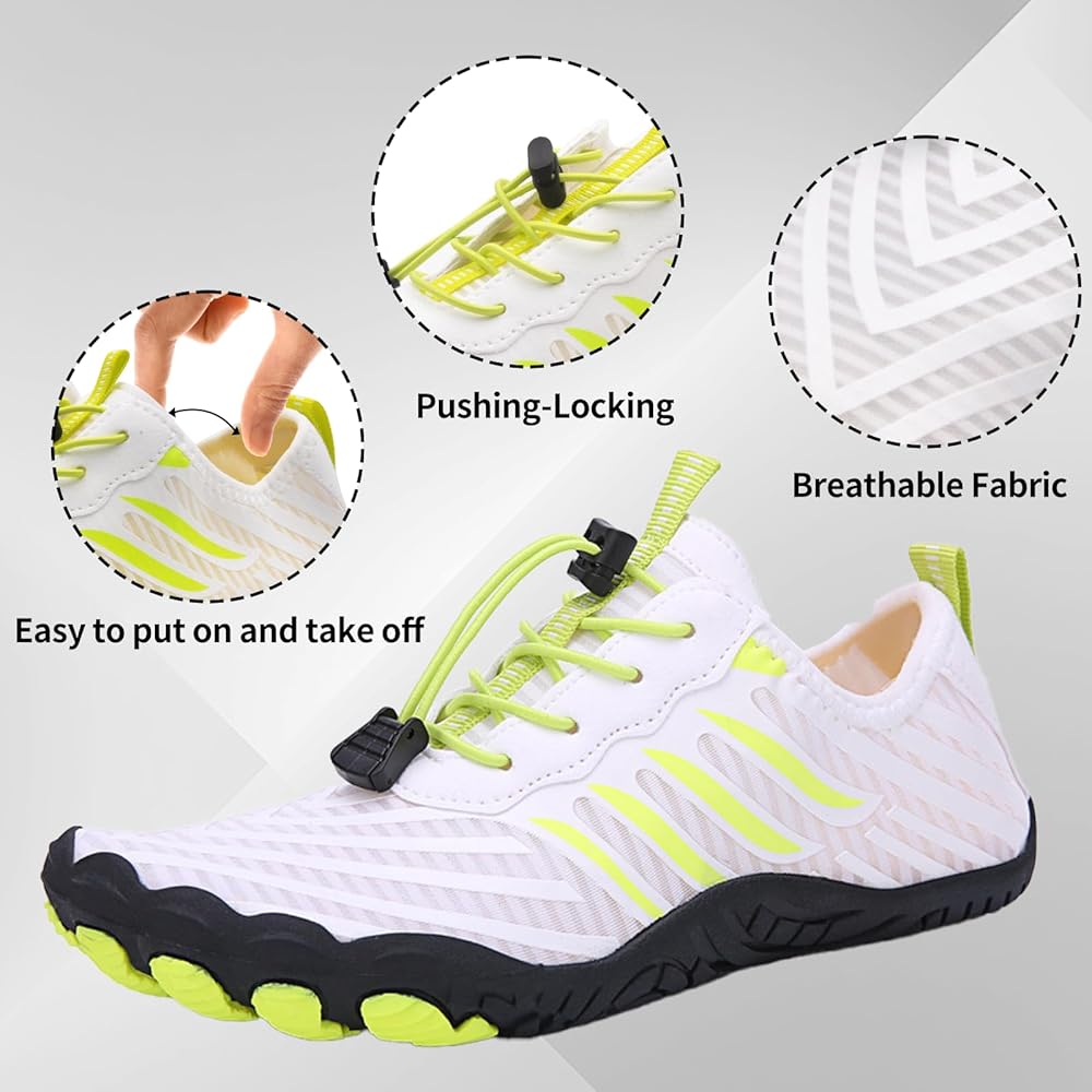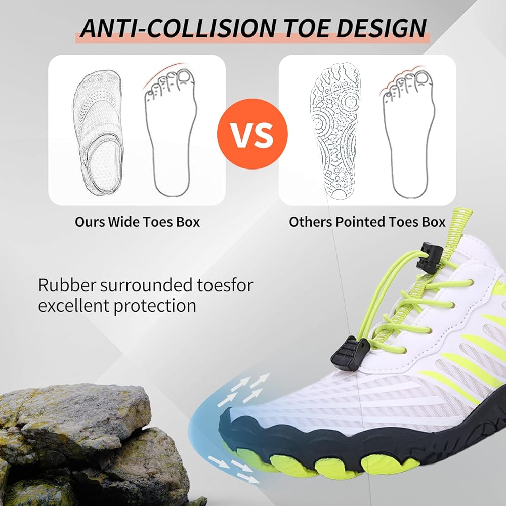 • 【Multi-Terrain Grip】Wave-patterned rubber outsole with 3D anti-slip dots delivers stability on wet rocks, trails, and tiles. Reinforced TPU frames protect against sharp debris without sacrificing barefoot flexibility.