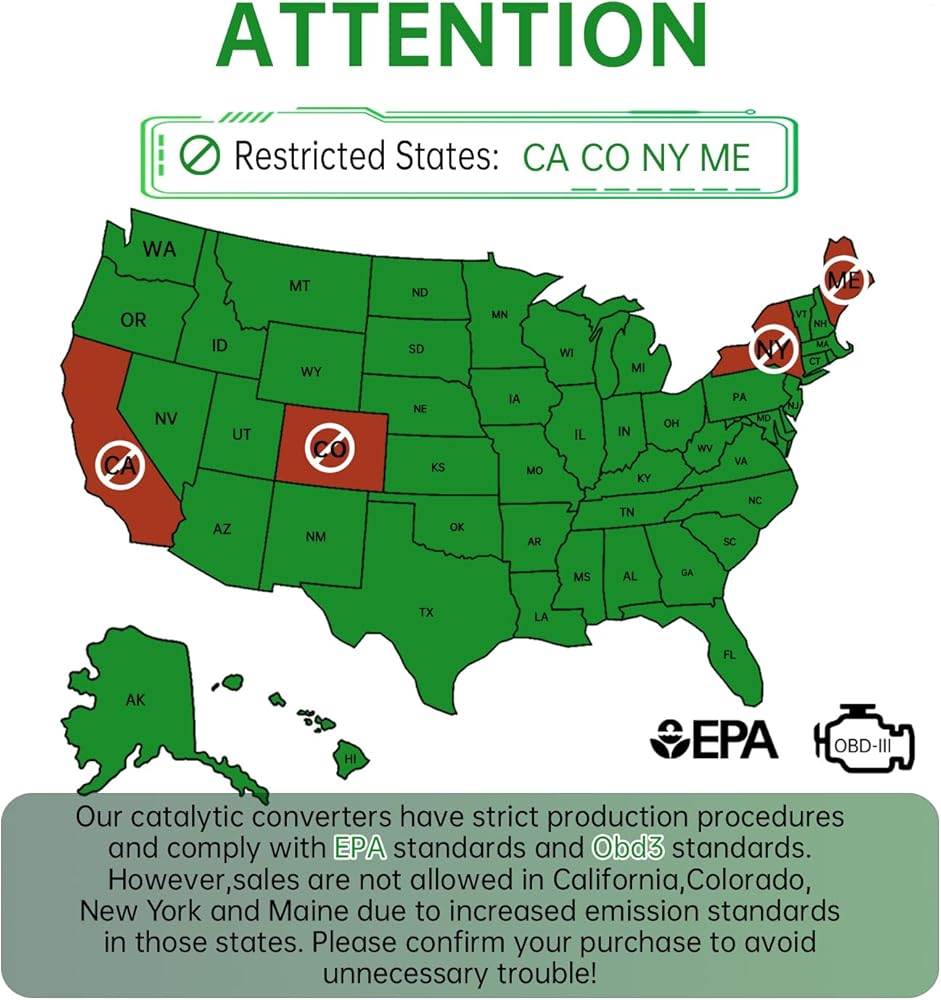 【EPA Compliance】 Meets EPA standards for Federal Emissions; not suitable for sale or installation in California, Colorado, Maine, or New York. Note: Confirm your vehicle's Emission Control Information Label and state laws to ensure compliance.