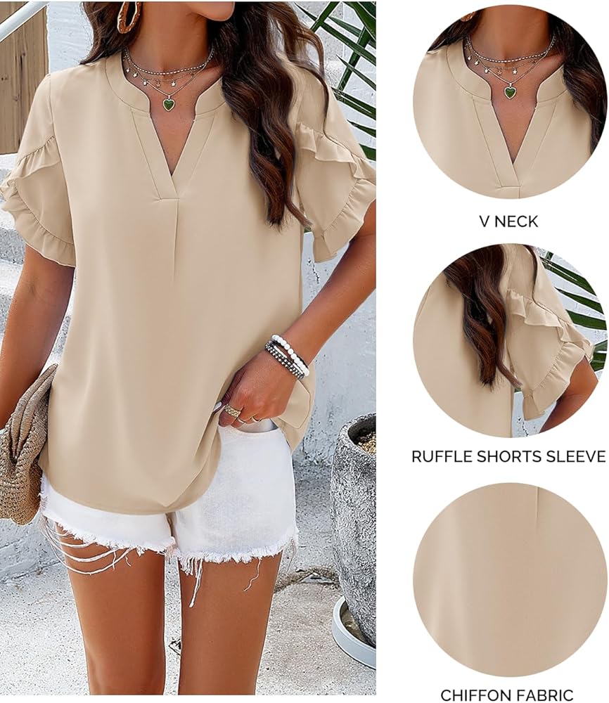 Samefar Womens Tops Dressy Casual V Neck Ruffle Shot Sleeve Shirts Loose Flowy Chiffon Work Business Blouses