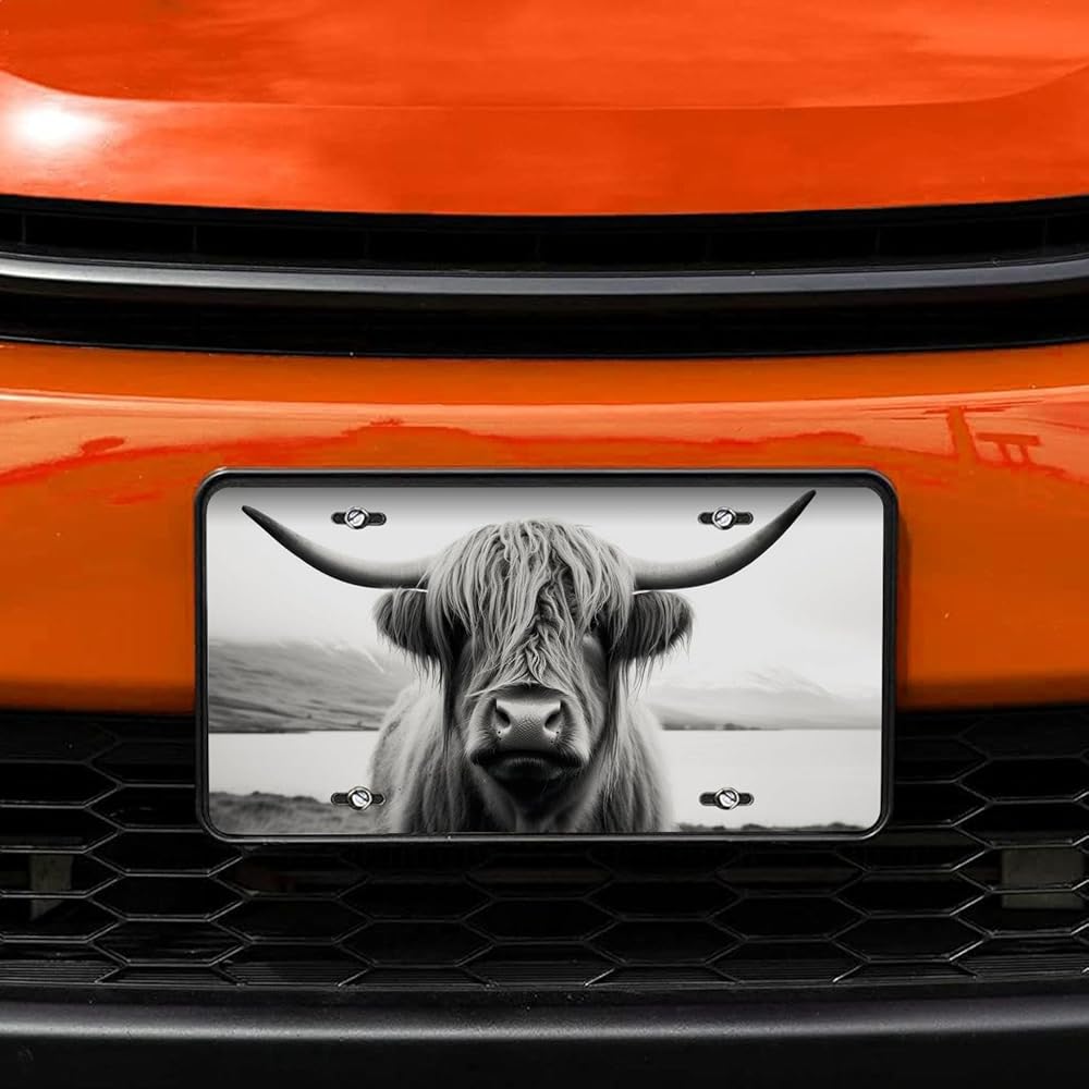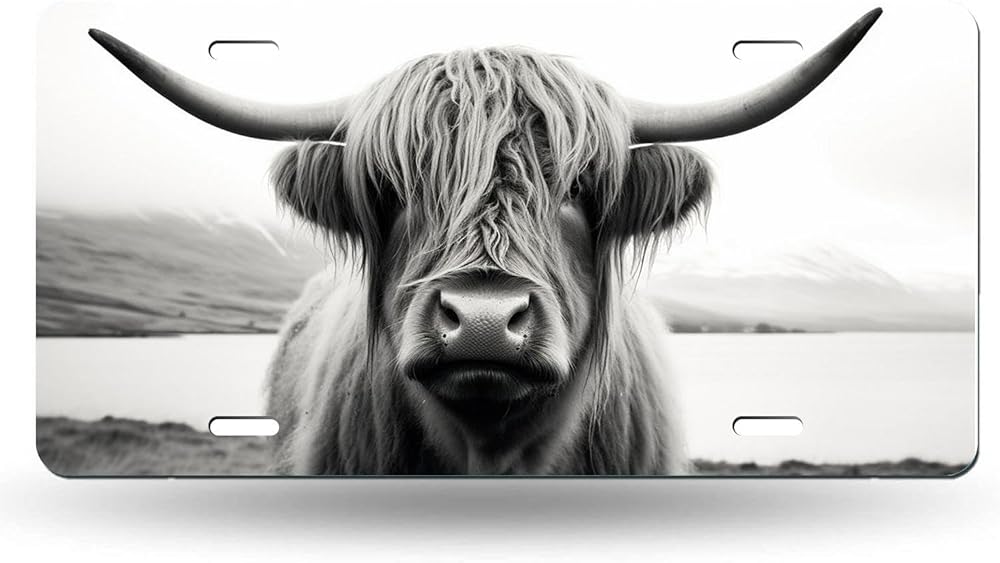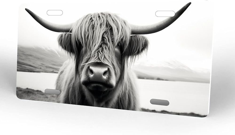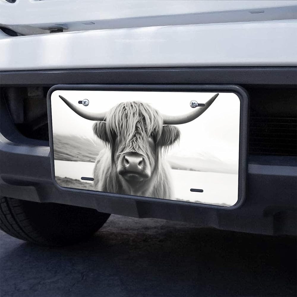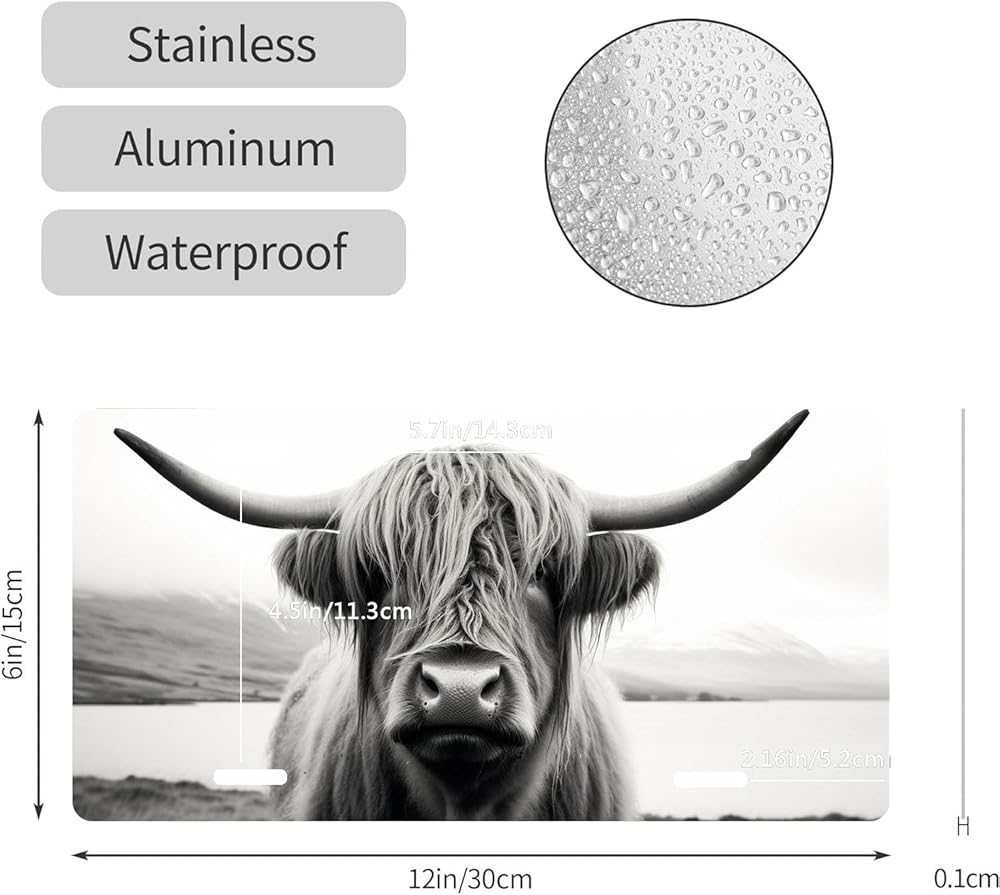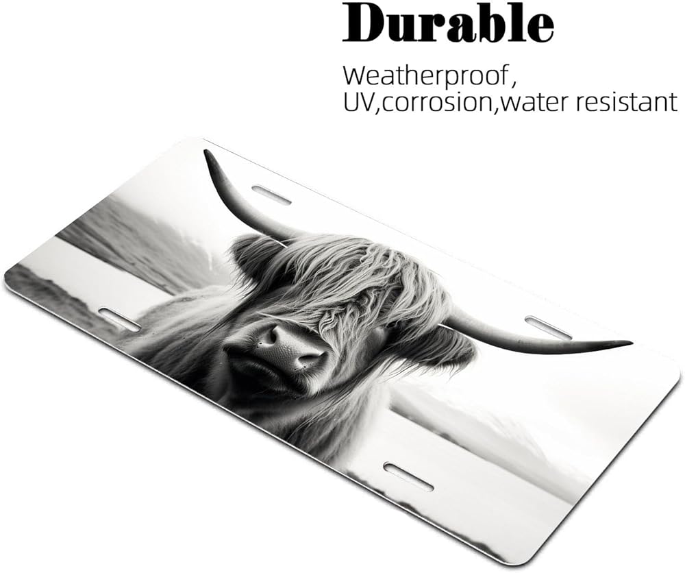 أبيض وأبيض اسكتلندا المرتفعات البقر اللوحة الفنية اللوحة اللوحة ، لوحة ترخيص للسيارة المعدنية المزخرفة مع 4 ثقوب ، 6 × 12 بوصة