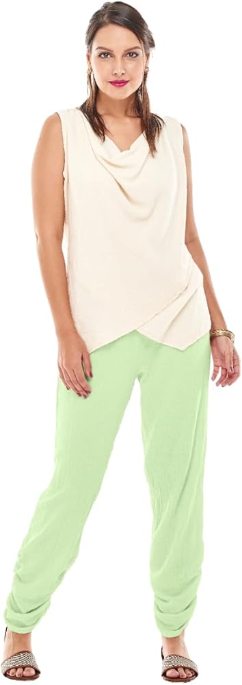 A slender fitted cotton gauze pant with a ruched hem bottom, great paired with our longer, fuller tops.