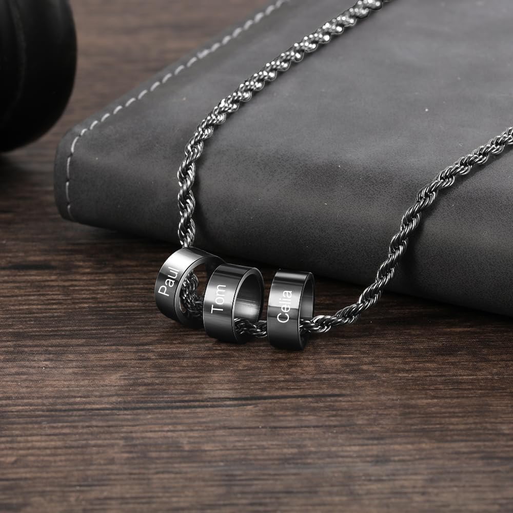 Make a meaningful statement with this elegant personalized name necklace featuring a classic rope chain design. Available in three stunning finishes - sleek black, brilliant silver, or luxurious gold - this versatile piece allows you to showcase special names or words that matter most to you. The necklace comes with customizable ring beads that slide smoothly along the durable rope chain, creating a unique and personal arrangement. Each character is precisely engraved on the individual rings for clear legibility and lasting beauty. The sophisticated rope chain pattern adds texture and visual interest while ensuring strength and durability for everyday wear. Perfect as a thoughtful gift or a meaningful addition to your own jewelry collection, this necklace offers a contemporary way to keep cherished names close to your heart. The clean, modern design makes it suitable for both casual and formal occasions, while the quality construction ensures it maintains its appeal through regular wear.