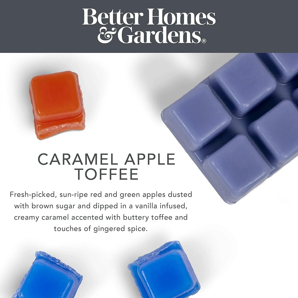 Better Homes and Gardens 6-Cube 2.5oz Clam Shell Wax Melts are highly fragranced and will fill your home with pleasing scent when warmed. . These melts are ideal for use with any Electric Wax Warmer. Simply break off one or two pieces of the melts and place in your favorite warmer. Wax melts allow you to fragrance your home without a flame and are easy to clean. This 2-pack contains 2 x 2.5oz Clam Shell Packs. Instructions: Place a wax cube in your electric wax warmer's dish, plug in warmer, turn on switch and enjoy the fragrance. For wax removal, turn off warmer & place cotton balls to absorb. Once cool to the touch, remove cotton balls & wipe dish clean with a dry cloth. Store in cool place. Wax will melt when warmed. May stain fabric and surfaces. May cause skin irritation. Avoid prolonged contact with skin. Do not add water to wax. KEEP OUT OF REACH OF CHILDREN AND PETS WARNING: For use only with wax warmers that conform to UL Std 283 (Wax warmer sold separately).