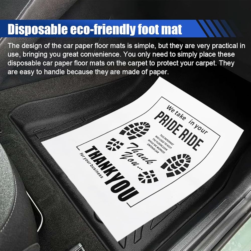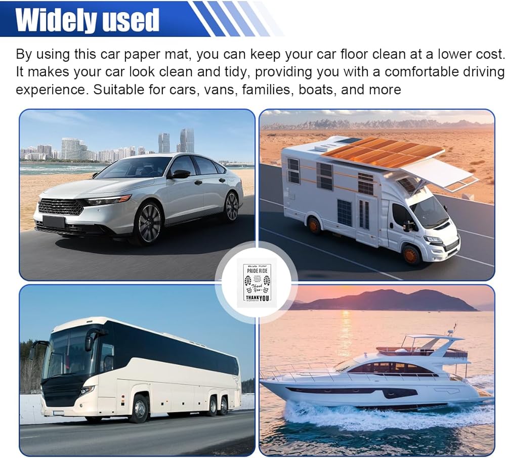 【Material】:This car paper floor mat uses high-quality kraft paper as the base, covered with a strong waterproof plastic film, with high toughness and strong protection. It effectively protects the carpet from being eroded by dust, oil, and water stains during vehicle maintenance or daily driving.
