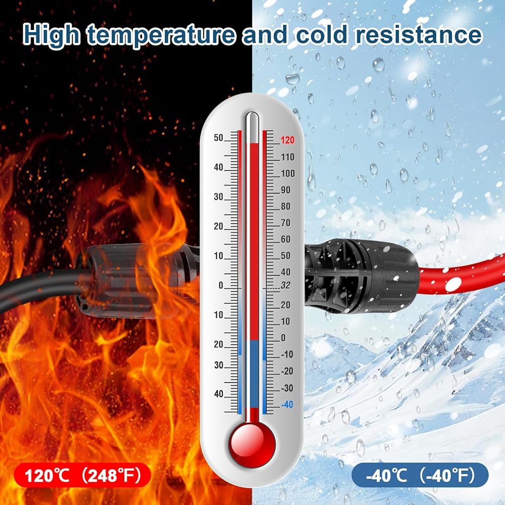 【كابل التمديد الشمسي متعدد الاستخدامات】 يقاوم هذا الكبل المتين الرطوبة ، وأشعة الأشعة فوق البنفسجية ، والتآكل ، واللهب ، مما يضمن عمر طويل للاستخدام في الهواء الطلق. مثالي لمحطات الطاقة الشمسية ، وموصلات الكهروضوئية ، والقوارب ، و RVs ، ومحطات الطاقة المحمولة ، فإنه يتصل بسهولة بمعظم الوحدات الشمسية. متوفر في 10 مقياس AWG وأطوال تتراوح من 5 إلى 100 قدم لتلبية احتياجات نظام اللوحة الشمسية المحددة.